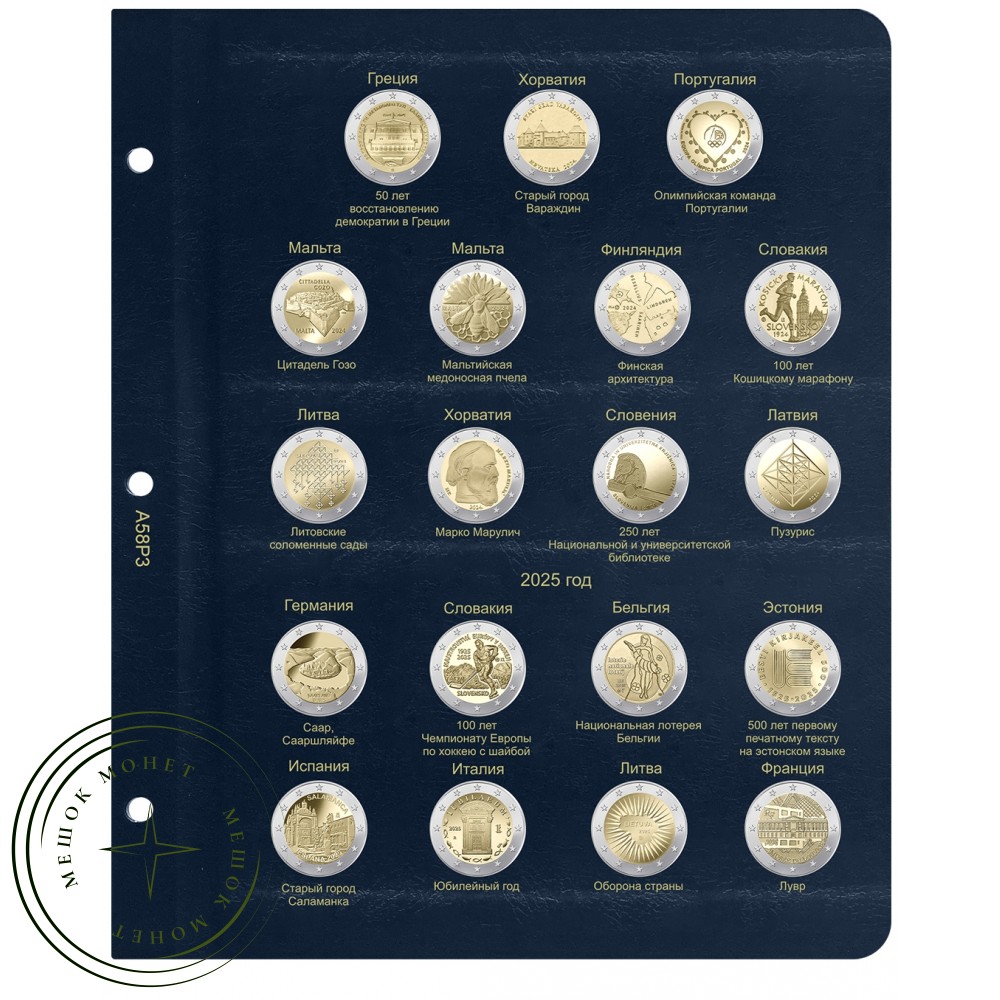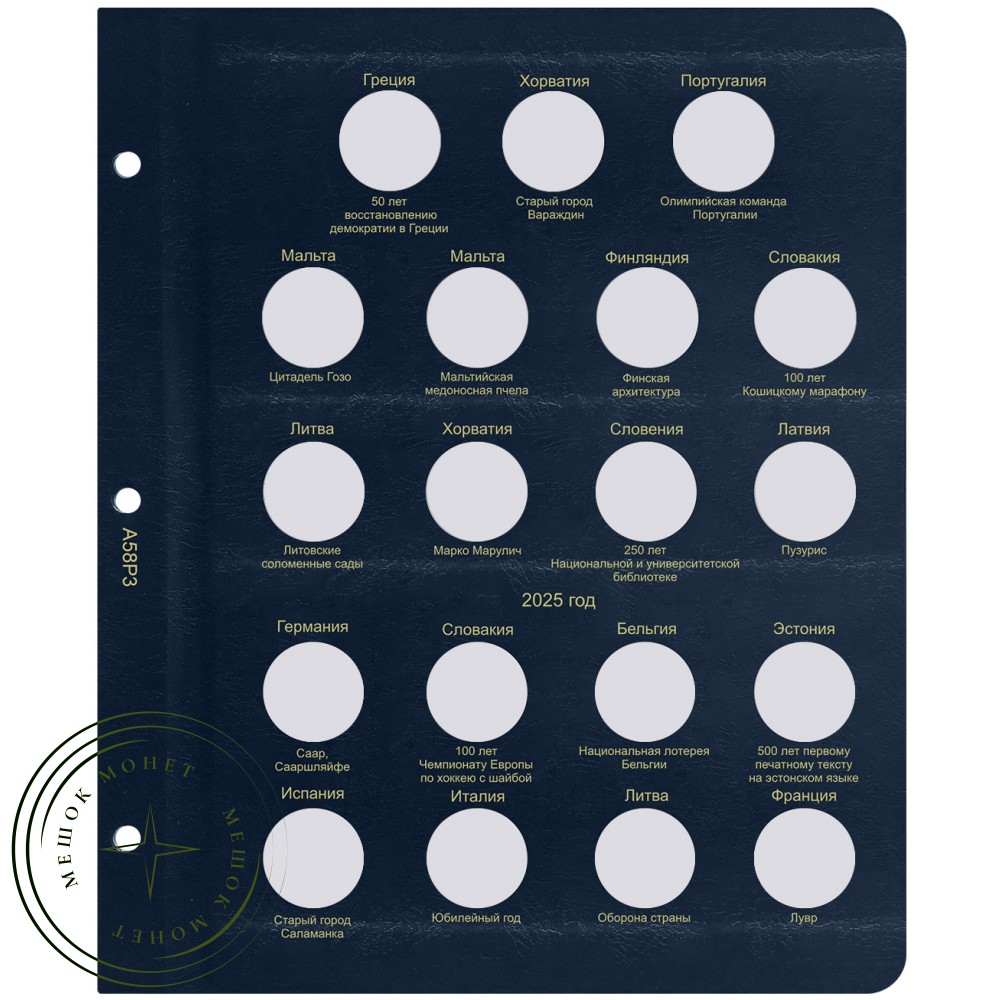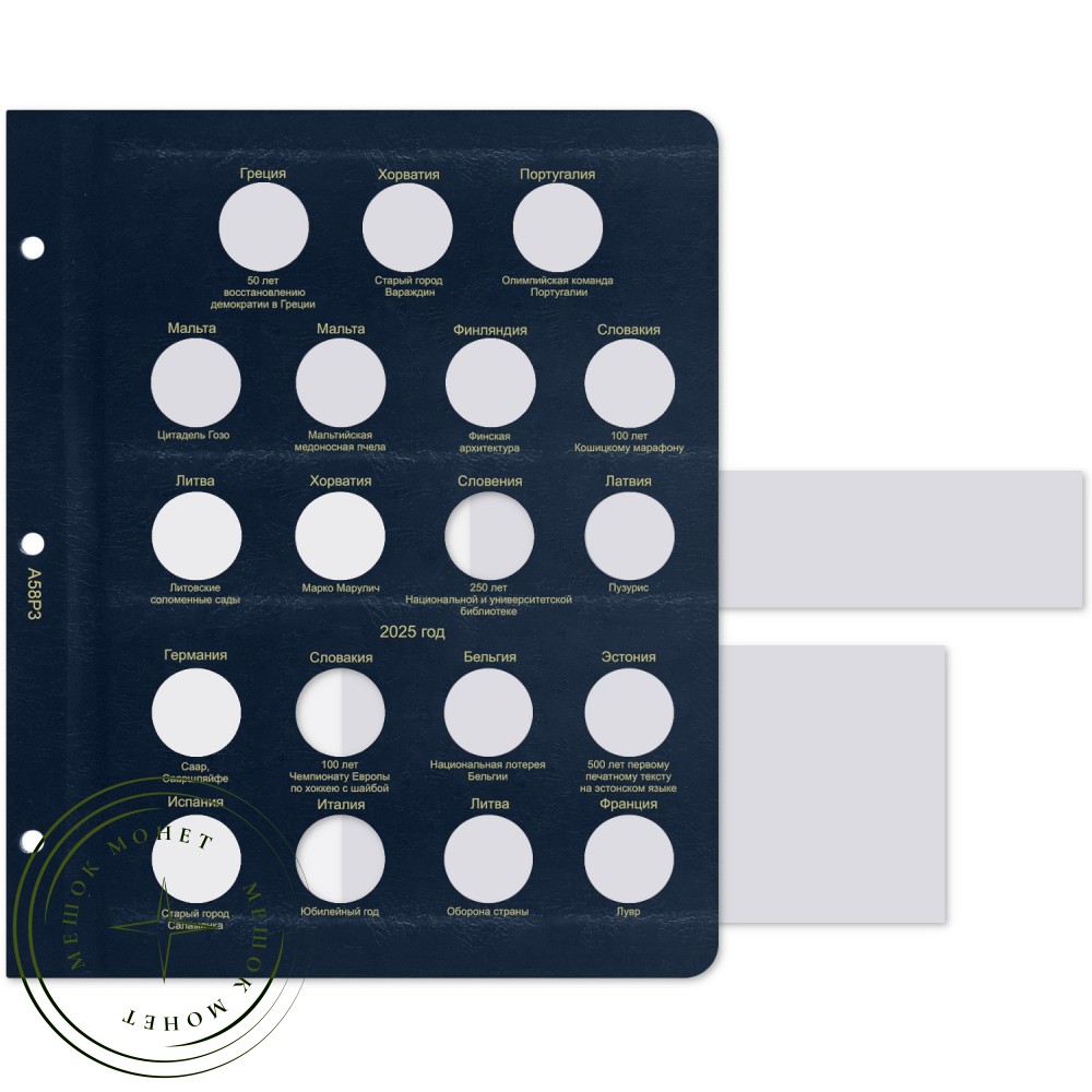 Лист альбома для монет 2 евро 2024-2025 годов выпуска. Производитель: КоллекционерЪ — российский производитель нумизматических товаров.