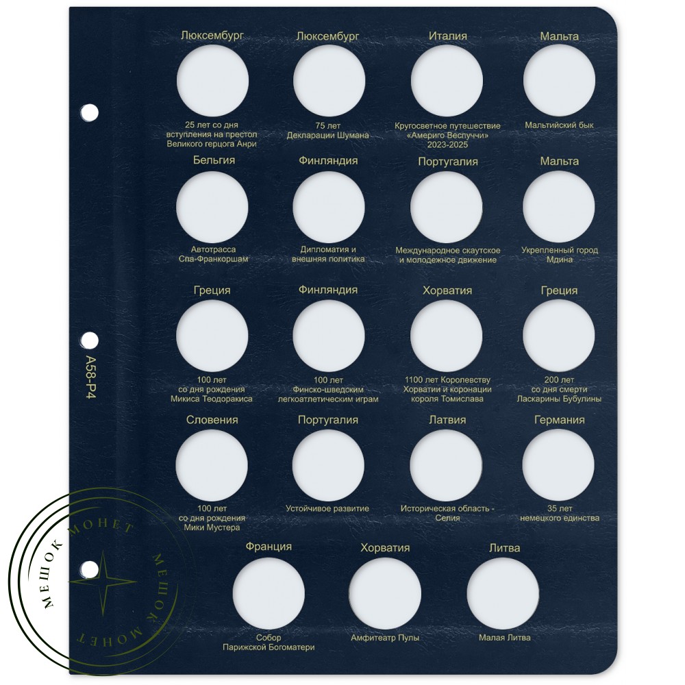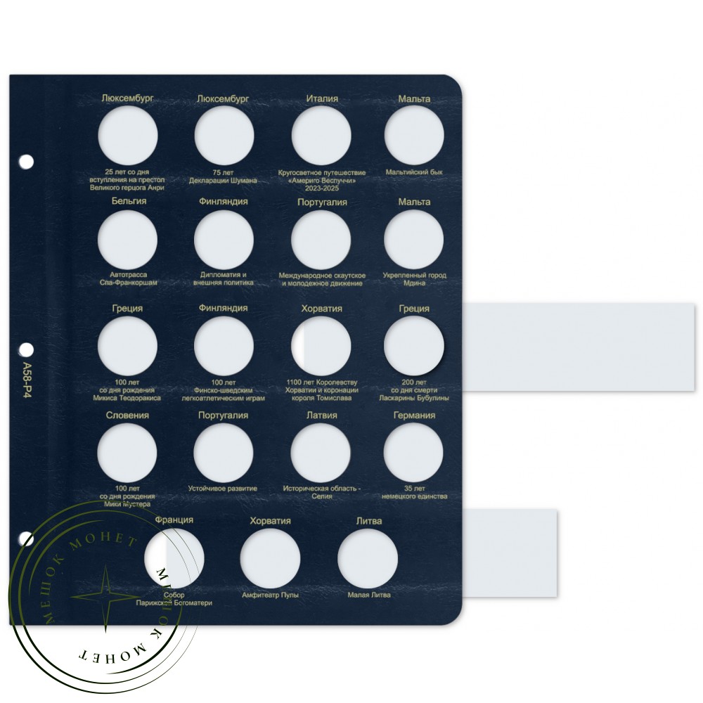 Предназначен для хранения юбилейных монет евро, выпущенных разными странами Европейского союза в 2025 году. На листе размещается 19 монет.