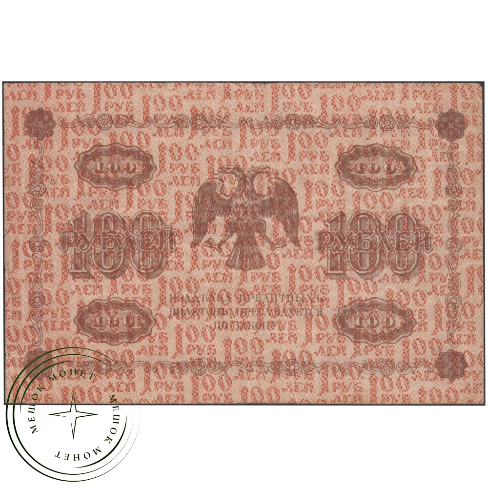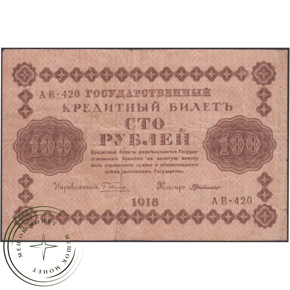 Государственная кредитная банкнота номиналом 100 рублей, выпущенная в 1918 году во времена РСФСР. Эти деньги были напечатаны по типографским клише Временного правительства.