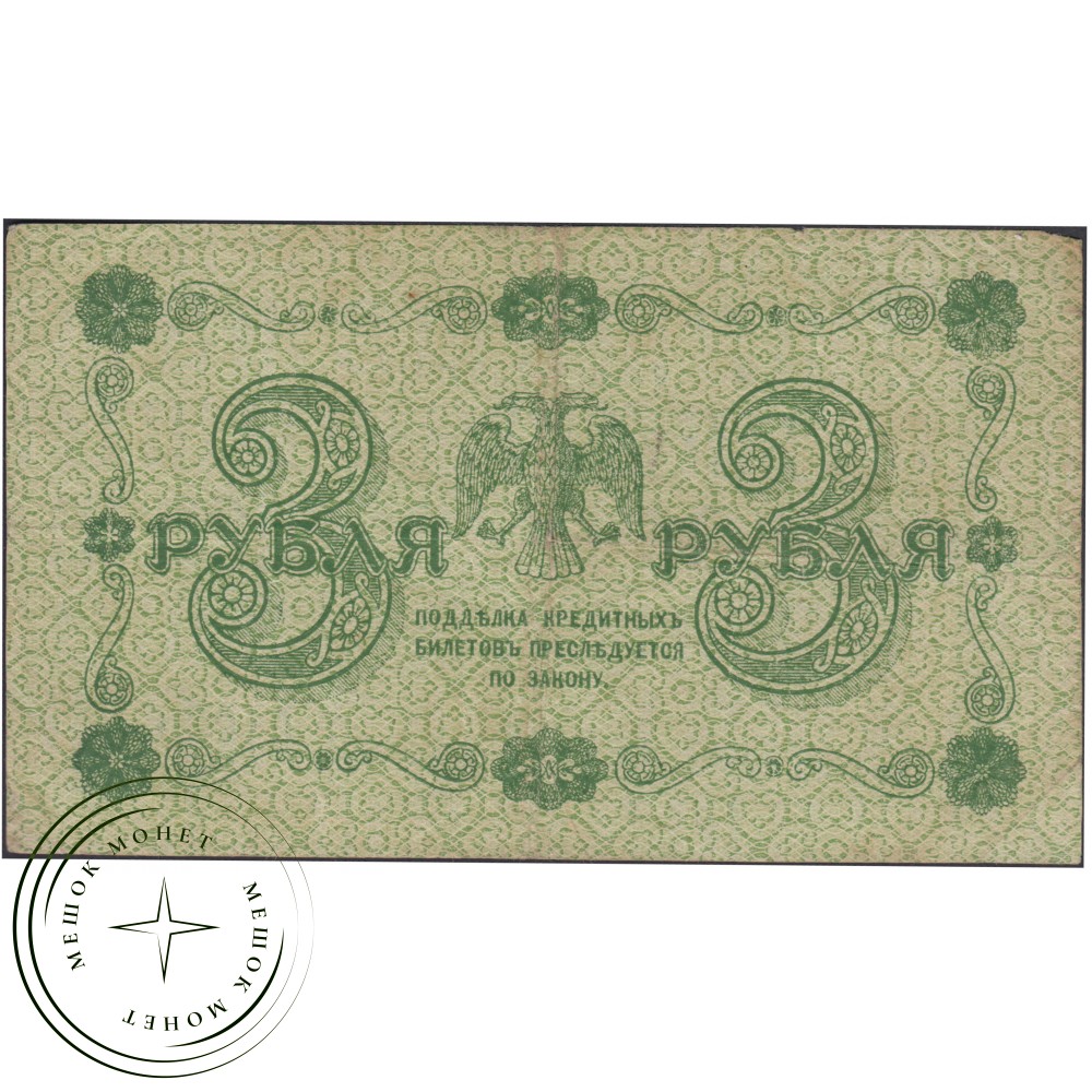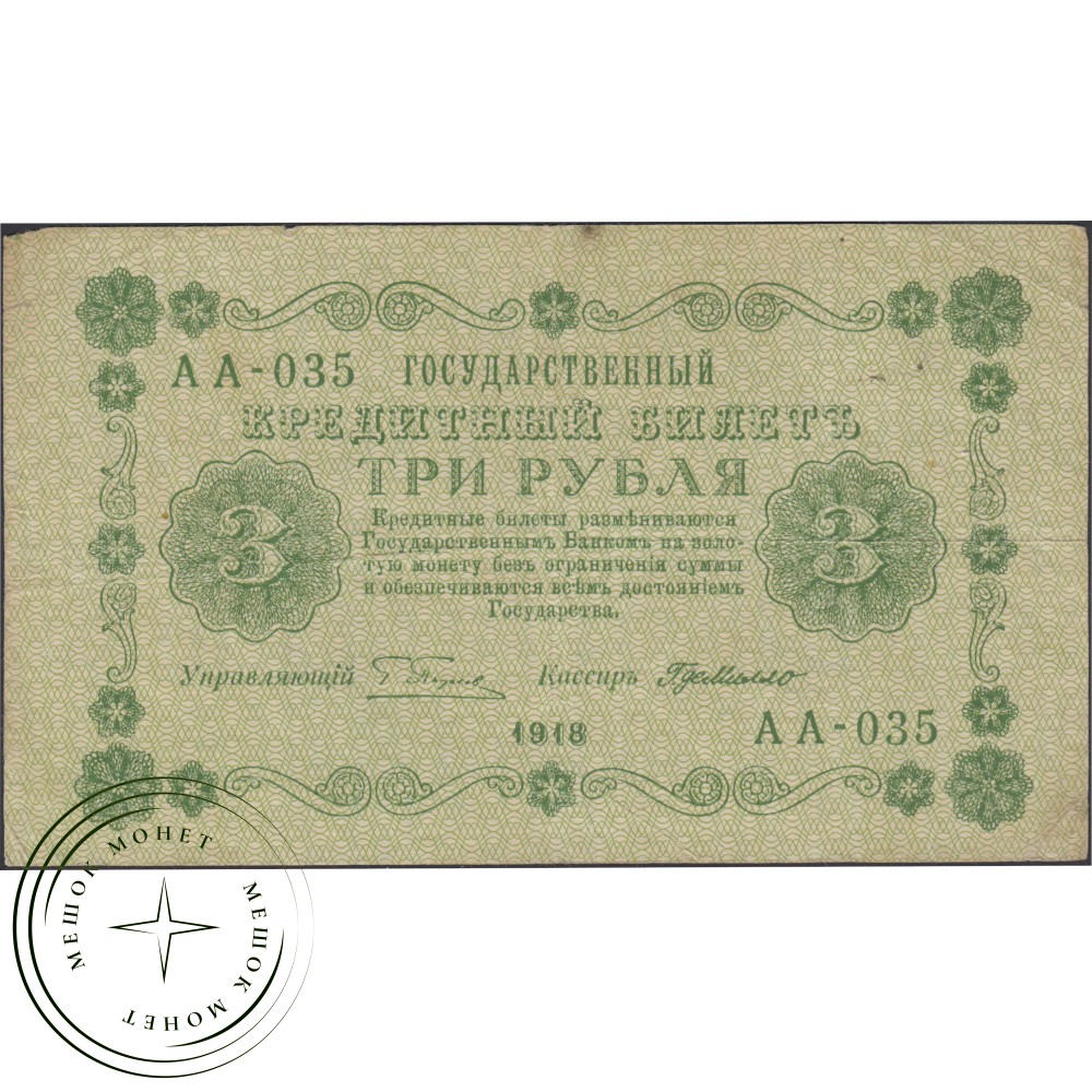 Купюра Государственного кредитного билета номиналом в три рубля, выпущенная в 1918 году.
