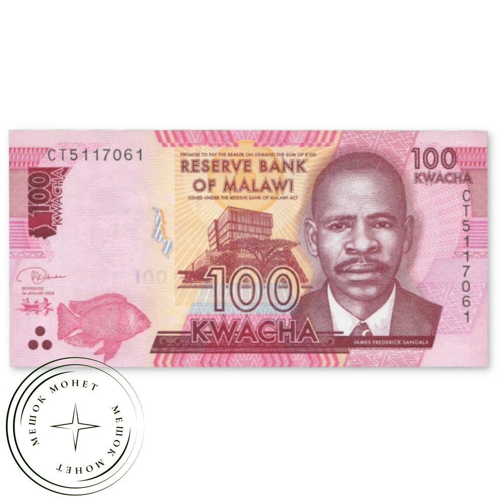 На лицевой стороне изображен портрет Джеймса Фредерика Сангалы (1900–1974). Здание штаб-квартиры Резервного банка Малави в Лилонгве с восходящим и сияющим над ним солнцем. Рыбаки ловят рыбу. Цихлида Ливингстона (Nimbochromis livingstonii), известная местным жителям как Калингоно.
