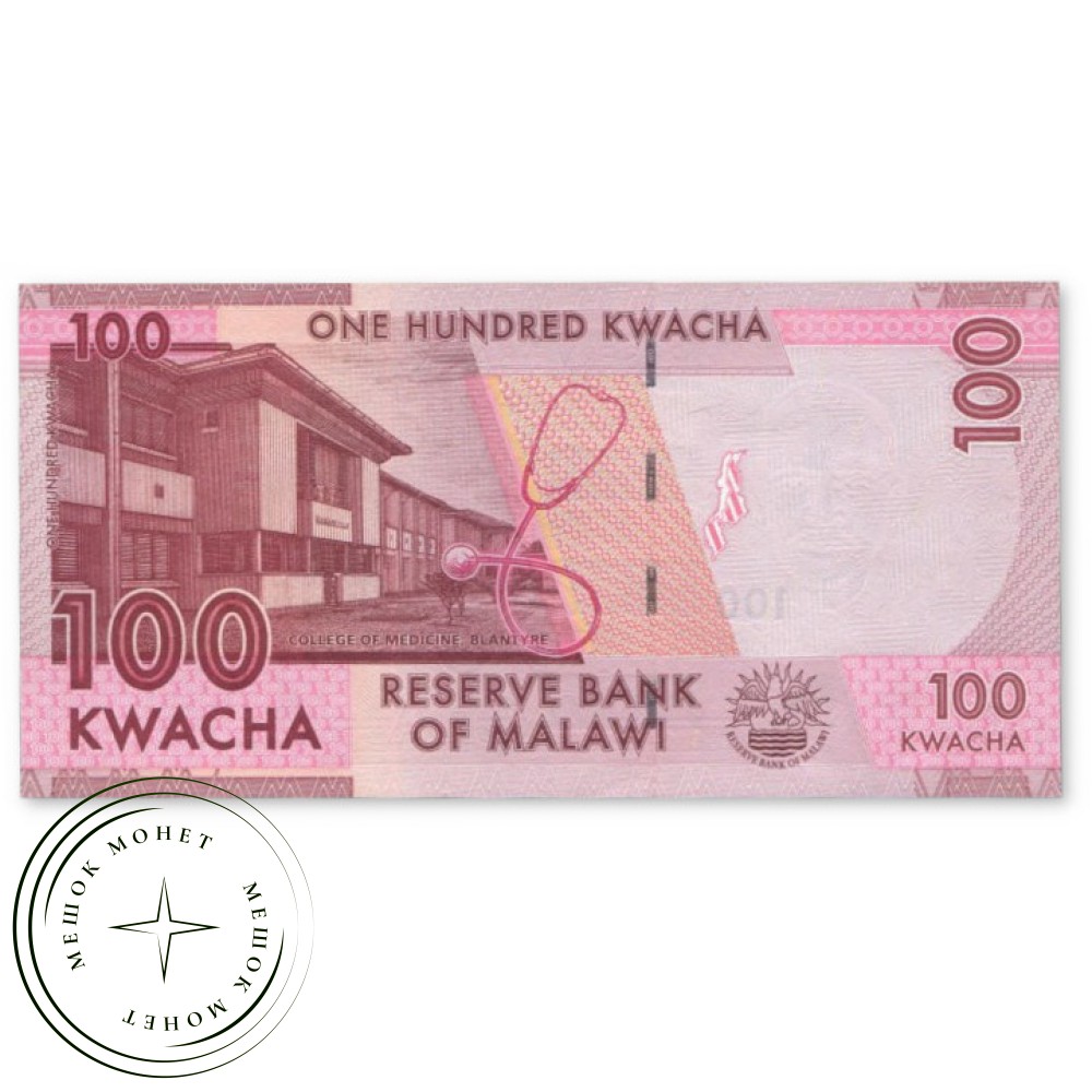 На оборотной стороне Медицинский колледж в Блантайре. Виньетка — стетоскоп, символизирующий качественную медицинскую подготовку для предоставления основных медицинских услуг. Логотип Резервного банка Малави.