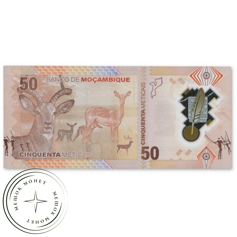 Надписи на португальском языке: "BANCO DE MOÇAMBIQUE" и "CINQUENTA METICAIS" (Пятьдесят метикалов).