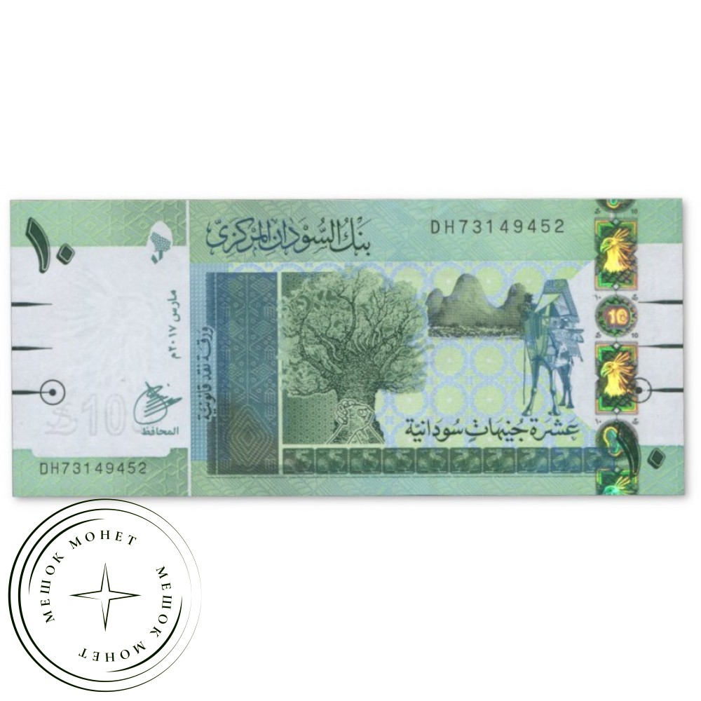 Лицевая сторона: Изображен пейзаж с деревом и верблюдом, а также надпись "بنك السودان المركزي" (Центральный банк Судана) и "عشرة جيهات سودانية" (Десять суданских фунтов).