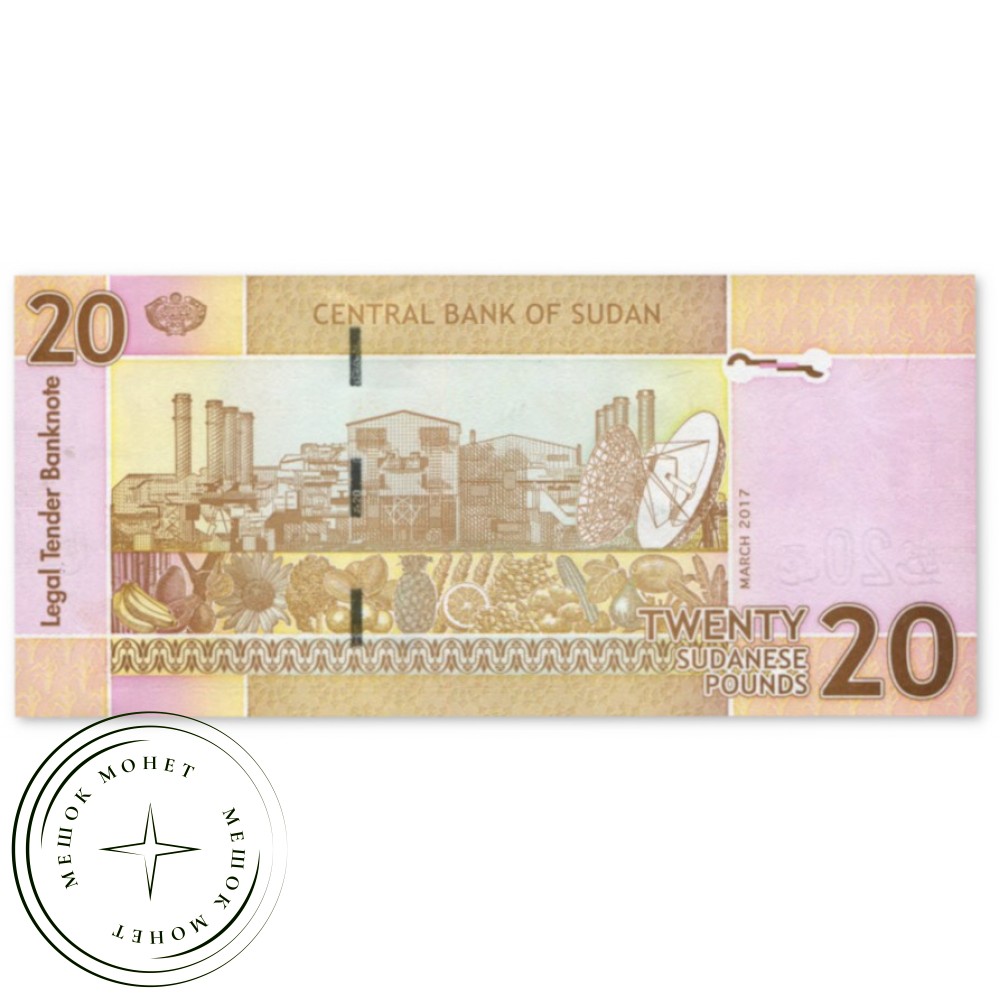 Банкнота номиналом 20 суданских фунтов, выпущенная Центральным банком Судана в 2017 году.
