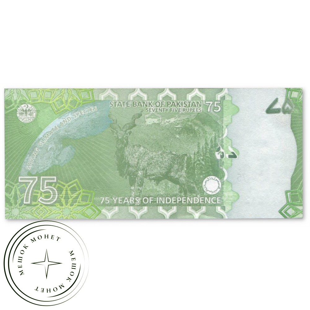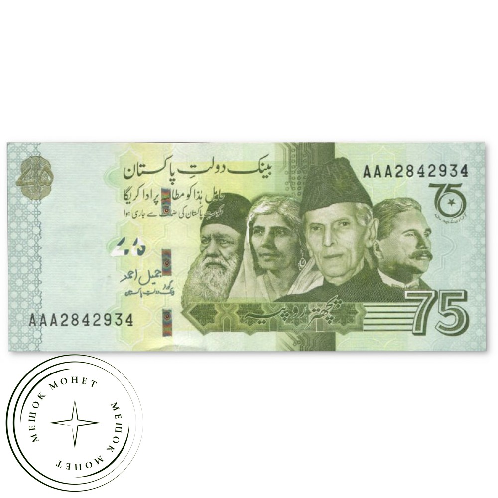 Памятная банкнота Пакистана номиналом 75 рупий, выпущенная в 2022 году в честь 75-летия независимости Пакистана.
