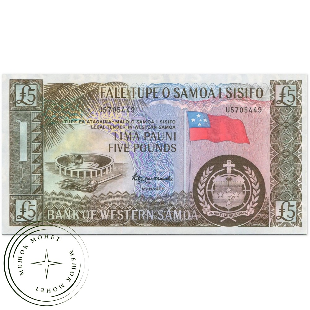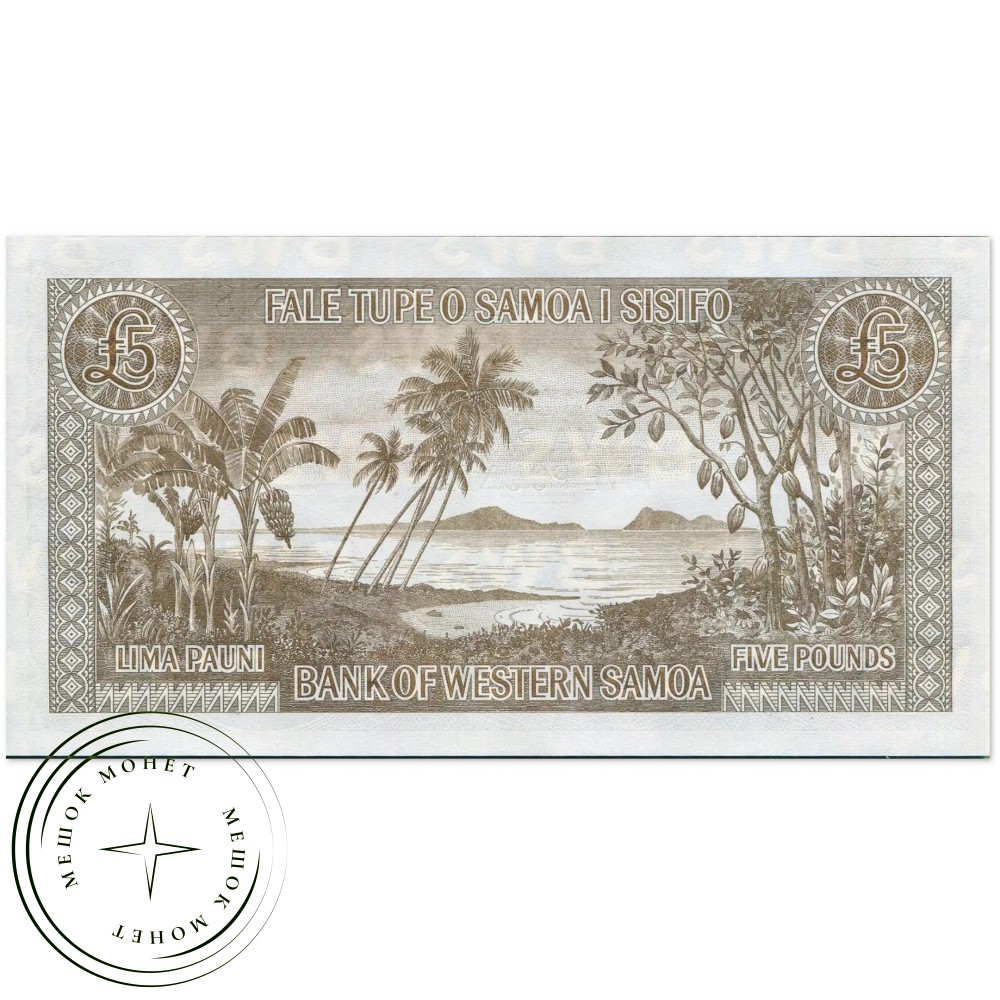 Банкнота номиналом 5 фунтов (Lima Pauni), выпущенная для Западного Самоа. Это современный официальный репринт (выпуск 2020 года) банкноты образца 1963 года. Репринты были изготовлены компанией Thomas De La Rue с использованием перегравированных печатных пластин 1967 года.