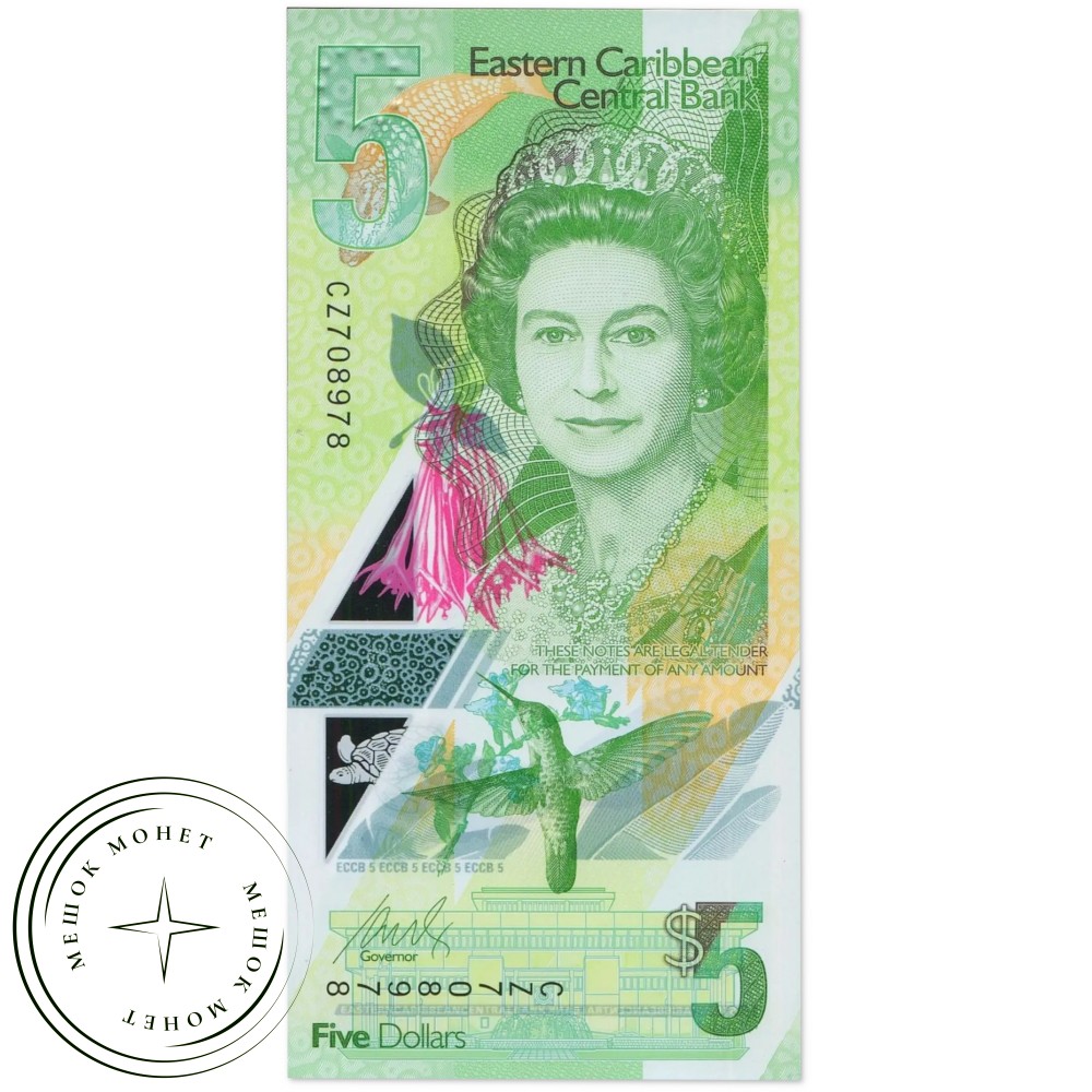 Полимерная банкнота номиналом 5 восточнокарибских долларов, выпущенная Восточно-Карибским Центральным банком (ECCB). Этот тип банкнот был введен в обращение в период с 2019 по 2021 год в рамках обновления денежного ряда.