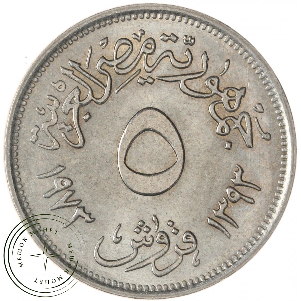 Монета номиналом 5 пиастров 1973 года, посвящённая Каирскому базару. Страна: Египет. Состояние: UNC.