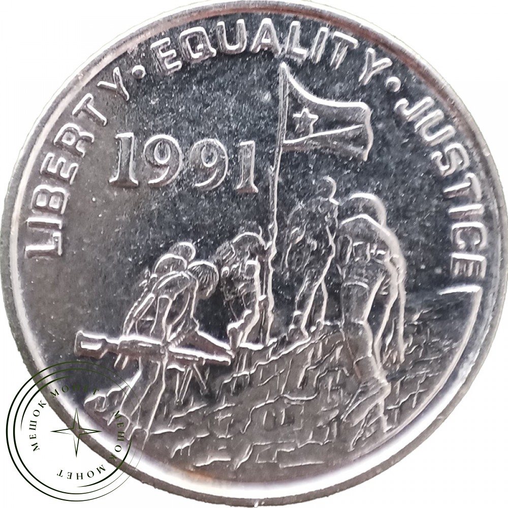 На реверсе изображены эритрейские партизаны, которые водружают флаг независимости после освобождения от войск Эфиопии 24 мая 1991 года. Наверху полукругом девиз: Свобода Равенство Правосудие. Единственный год выпуска.