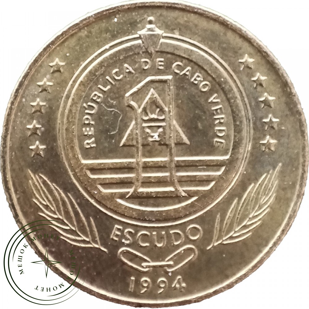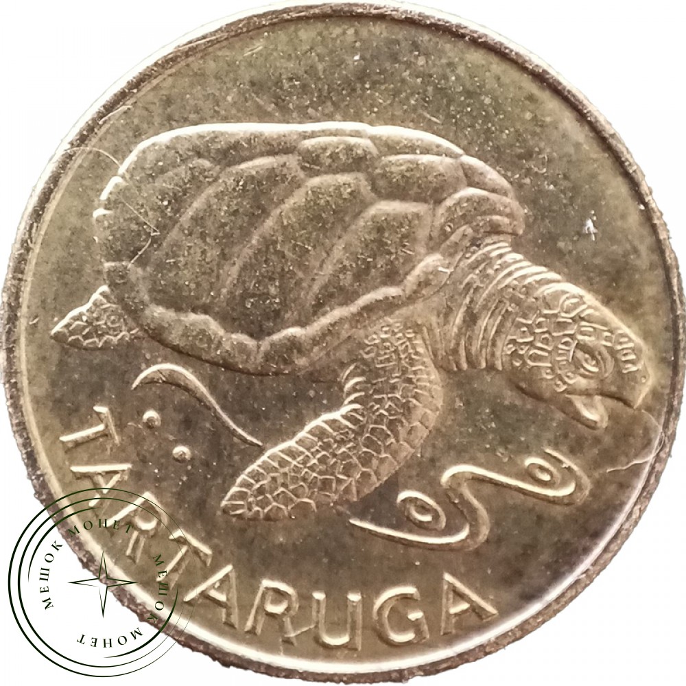 На аверсе в центре — номинал в цифровом значении внутри государственного герба. Герб Кабо-Верде представляет собой равносторонний треугольник с факелом в середине и круговой надписью сверху — названием страны на португальском языке. Эти элементы обрамляют две круглые рамки, по обе стороны от которых изображено по пять звезд, символизирующих 10 островов страны. Внизу герба — три звена цепи и две пальмовые ветви. Год чеканки указан внизу в центре. На реверсе изображена большая морская черепаха.