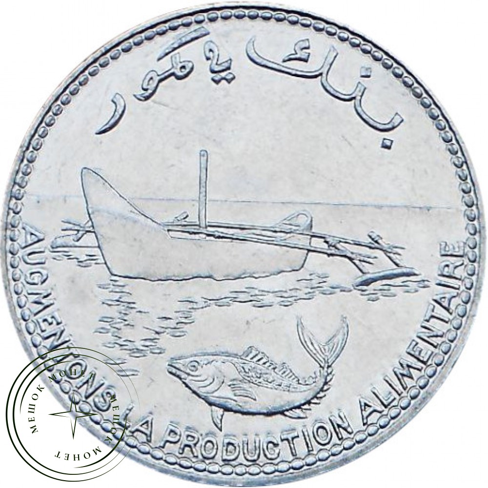 Аверс: На аверсе изображена лодка и рыба, а также надпись на арабском языке и по окружности на французском: "AUGMENTONS LA PRODUCTION ALIMENTAIRE" (Увеличим производство продуктов питания).
