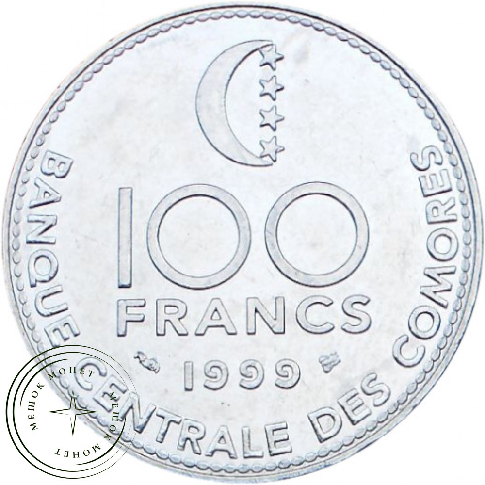 Реверс: На реверсе указан номинал "100 FRANCS", год выпуска "1999" и надпись "BANQUE CENTRALE DES COMORES" (Центральный банк Коморских островов). Также присутствует полумесяц со звёздами.