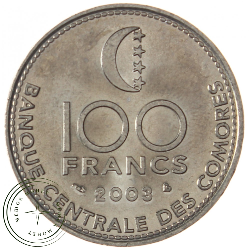 На реверсе монеты указан номинал "100 FRANCS", год выпуска "2003" и надпись "BANQUE CENTRALE DES COMORES" (Центральный банк Коморских островов), а также полумесяц и звезды.