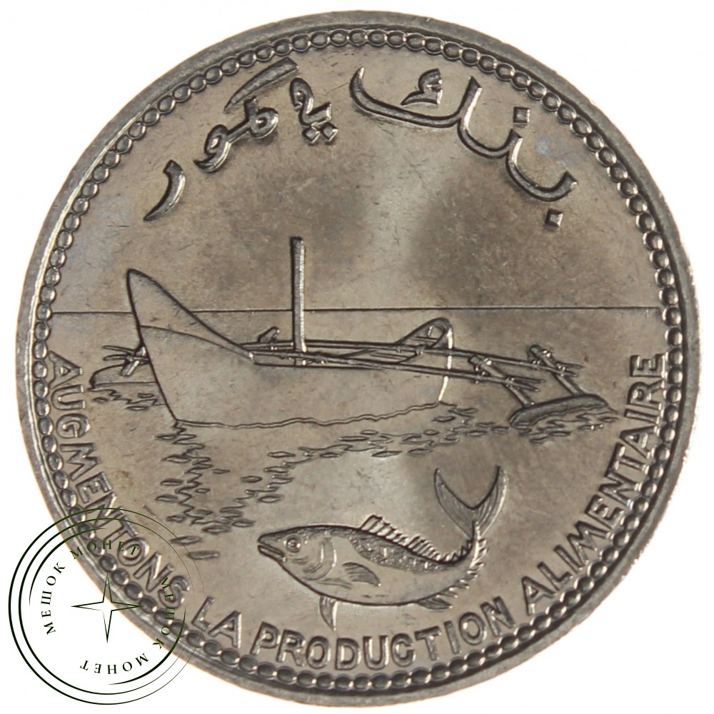 На аверсе монеты изображена лодка, рыба и надпись на французском языке "AUGMENTONS LA PRODUCTION ALIMENTAIRE" (Увеличим производство продовольствия), а также надпись на арабском языке.