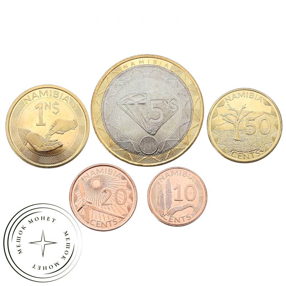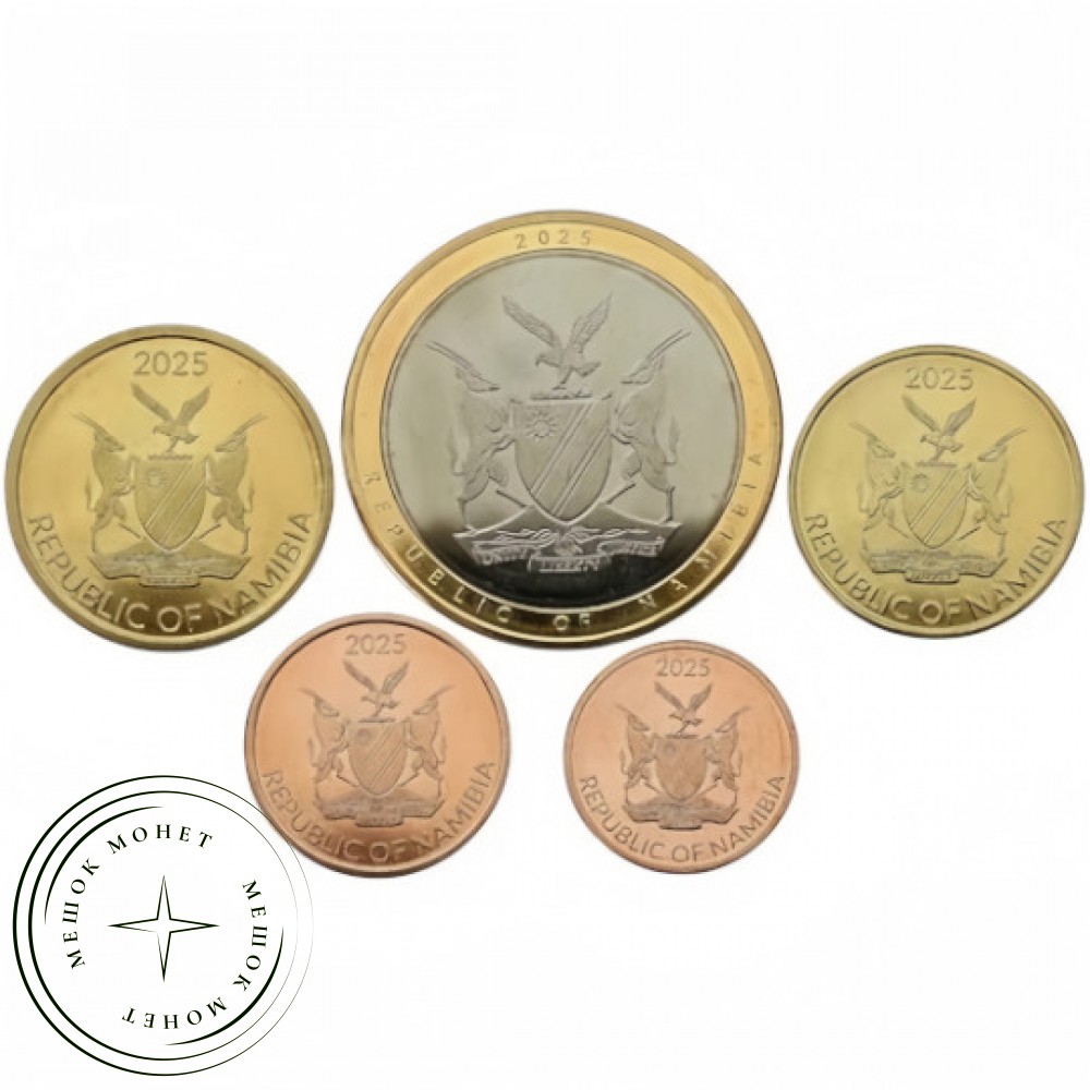 Набор из пяти монет Намибии 2025 года. На каждой монете изображён герб Намибии, а также год выпуска — 2025.