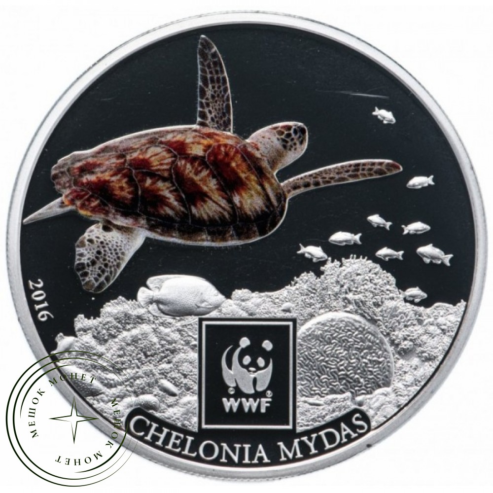 Памятная монета номиналом 100 шиллингов 2016 года выпуска, посвященная зеленой морской черепахе (Chelonia mydas) в рамках серии Всемирного фонда дикой природы (WWF).