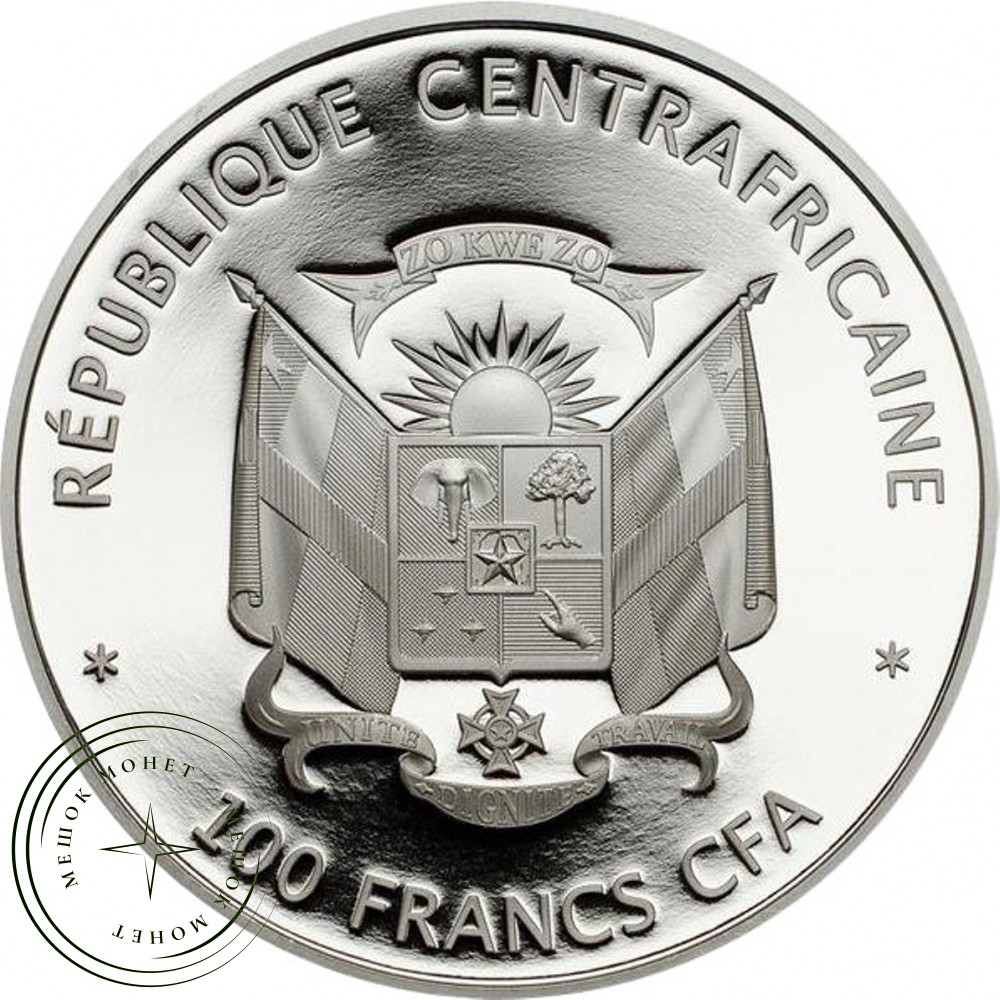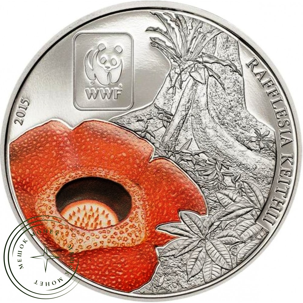 Коллекционная монета Центральноафриканской Республики номиналом 100 франков КФА, выпущенная в 2015 году в рамках серии Всемирного фонда дикой природы (WWF), посвященной цветку Раффлезия Китти (Rafflesia keithii).