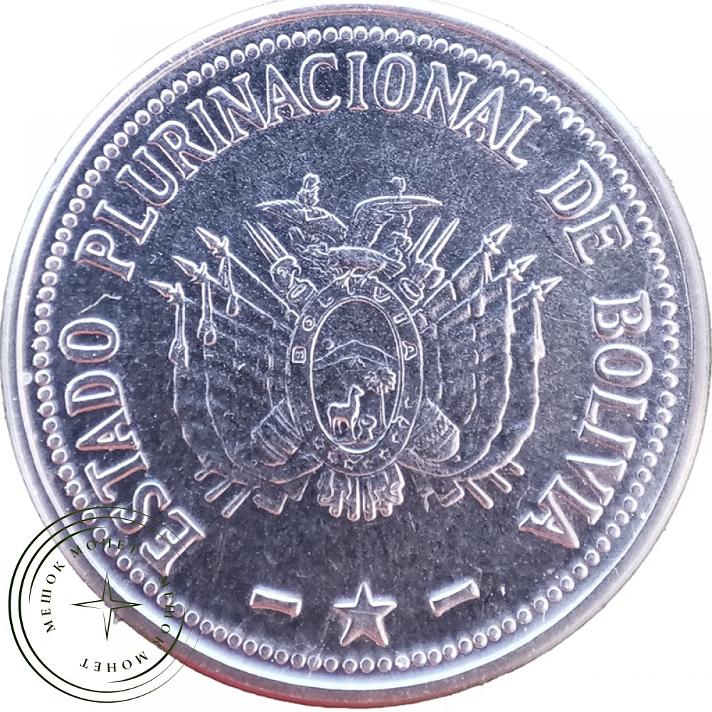 На аверсе отчеканен герб Боливии. Герб состоит из овального щита, на котором сидит андский кондор. Щит опирается на две перекрещённые пушки, которые, в свою очередь, опираются на шесть флагов, четыре мушкета, топор, стремя, фригийский колпак и две ветви лавра. Край щита украшен десятью звёздочками, которые символизируют девять провинций страны, а также десятую, нижняя часть территории которой входит в состав Чили, а верхняя — в состав Боливии. Внутри видна гора Черро Рико и сияющее солнце, а у подножья горы – альпака, вставшая под тень дерева, и сноп зерна, символизирующий сельскохозяйственные ресурсы страны. Пушки и мушкеты напоминают об освободительной борьбе, фригийский колпак и топор – о независимости, обретённой благодаря силе оружия, ветви лавра – о достигнутом мире, а сидящий на щите кондор, который смотрит вдаль — о том, что страна будет всегда на страже своих интересов. На реверсе – девиз «Единство — сила».