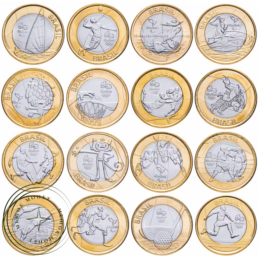 Полный набор из 16 памятных монет номиналом 1 реал, выпущенных в Бразилии в честь Летних Олимпийских и Паралимпийских игр 2016 года в Рио-де-Жанейро.
