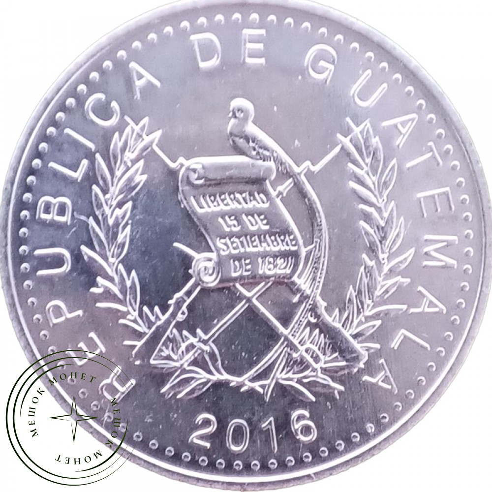 На аверсе — эмблема государства. На реверсе — стела Киригуа, место археологических раскопок майя в районе Исабаль. Чтобы подчеркнуть важность города, древние майя воздвигли крупные монолитные стелы из красного песчаника. Они были украшены тонкими барельефами, изображавшими королей, богов и священных животных (ягуары, жабы и крокодилы).