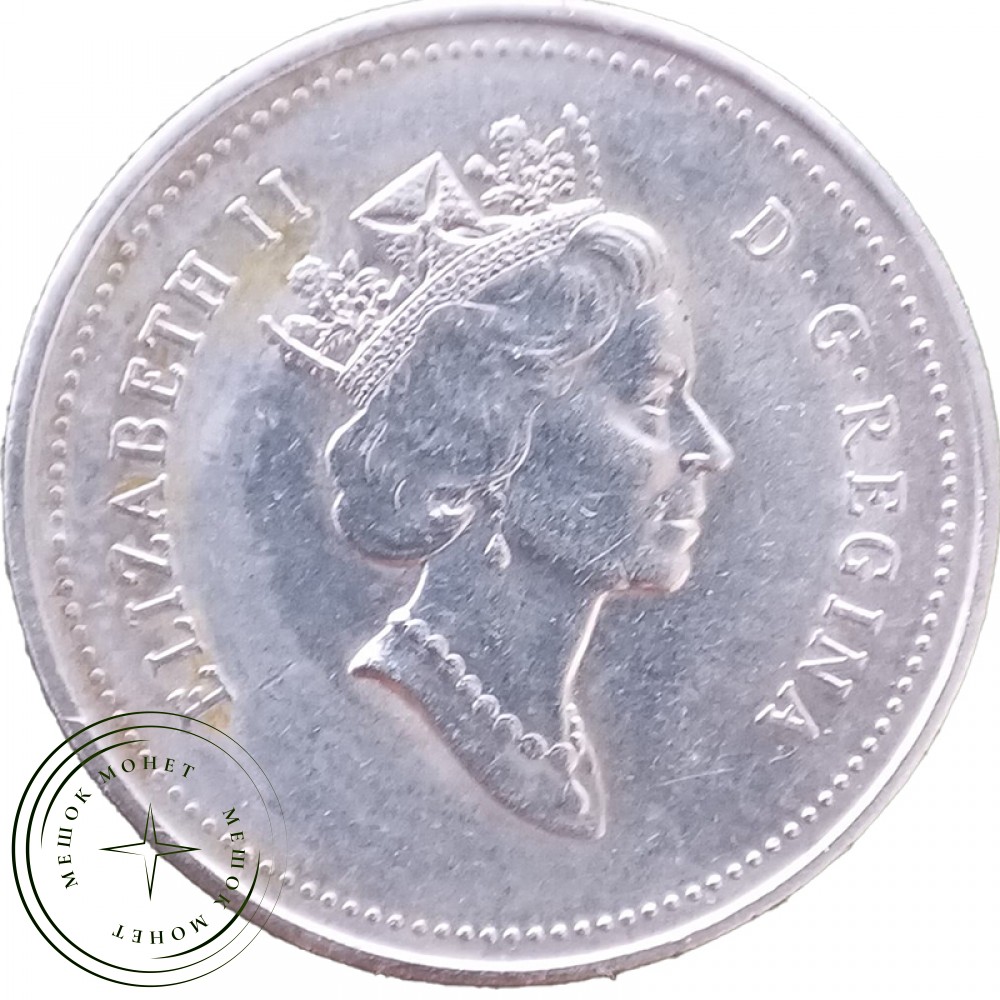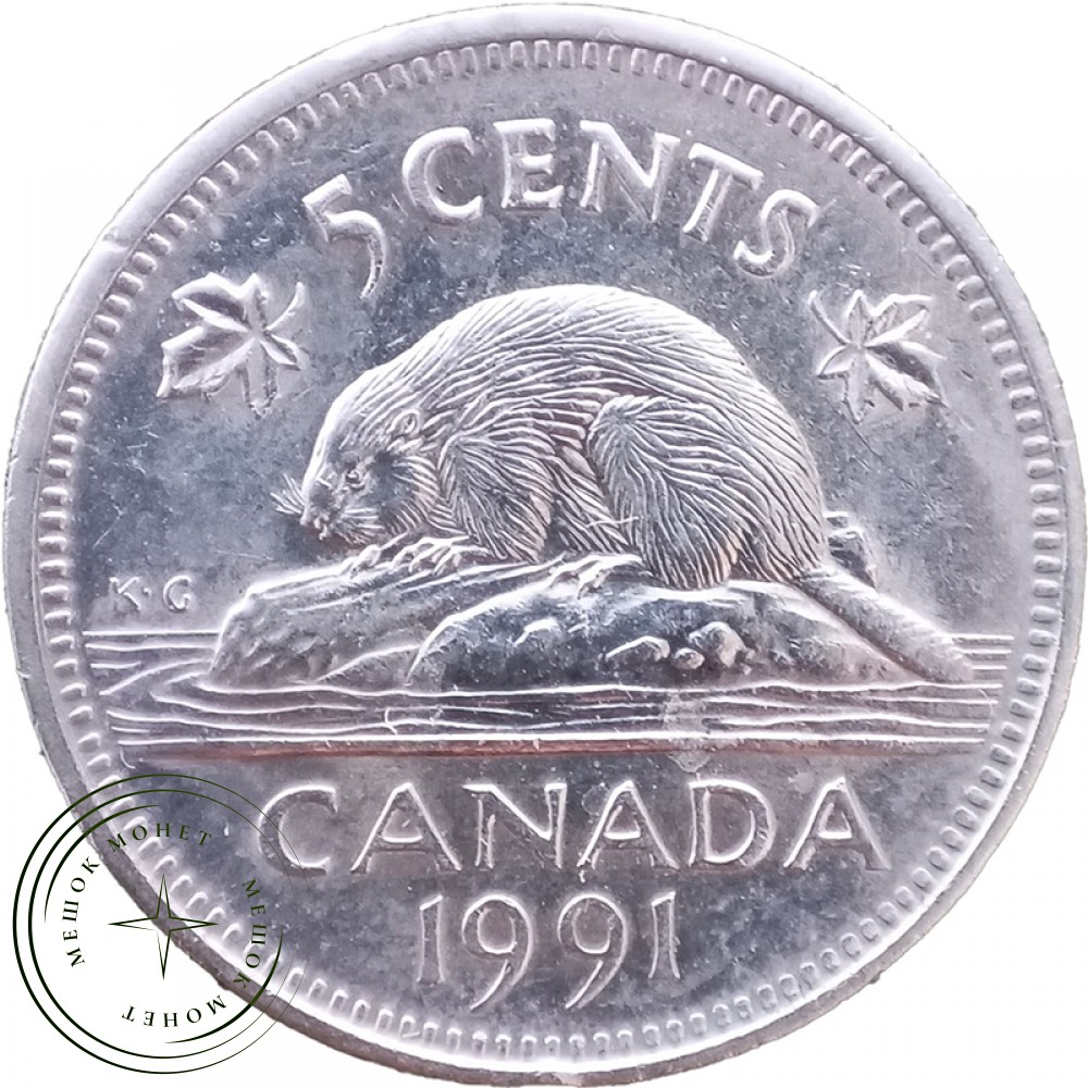 На реверсе монеты 5 центов мы видим бобра — охота на него когда-то была основным промыслом многих канадцев. Этот зверек стал живым символом страны, олицетворяя собой трудолюбие, предприимчивость и мирную жизнь.