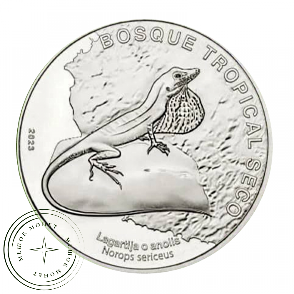 Изображение на аверсе: Шелковистый анолис (Anolis sericeus) с надписью "BOSQUE TROPICAL SECO" (Сухой тропический лес) и научным названием ящерицы "Lagartija anolis Norops sericeus".