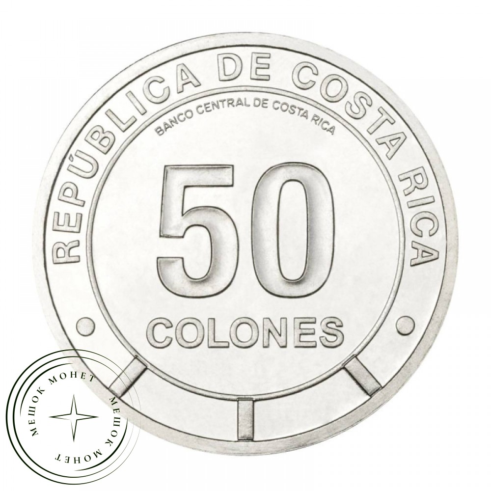 Изображение на реверсе: Номинал "50 COLONES", название страны "REPÚBLICA DE COSTA RICA" и "BANCO CENTRAL DE COSTA RICA" (Центральный банк Коста-Рики).