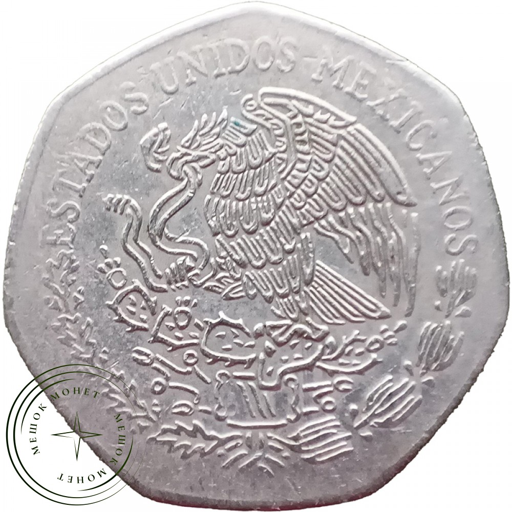 На аверсе изображен герб Мексики: орел, удерживающий в клюве и когтях змею. Одной ногой птица стоит на стебле нопаля, кактуса, широко культивируемого мексиканцами. Кактус опирается на пьедестал с изображением древнего символа воды ацтеков. В нижней части аверса отчеканена ветвь дуба и ветка лавра, скрепленные лентой. Мексиканская эмблема представляет собой аллегорию добра, побеждающего зло, и содержит символы, связанные с культурой ацтеков. Кактус рассказывает об основании города Мехико, возведенного на развалинах древнего Теночтитлана, название которого читается как "место кактусов". Орел символизирует солнце, а змея — землю. Ветви лавра и дуба — традиционные для европейской культуры символы страданий и победы.