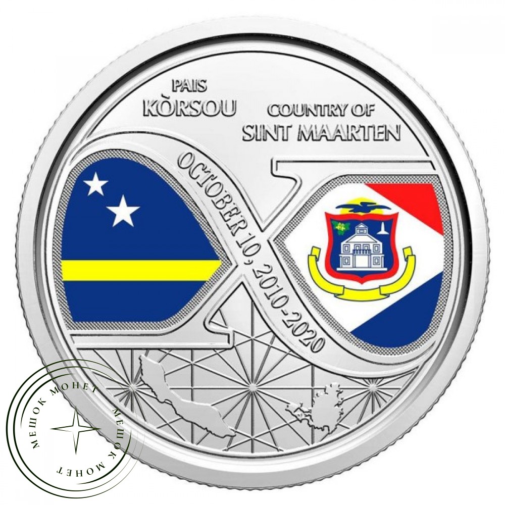 Аверс (левая монета): Изображена стилизованная римская цифра «X» с датами «OCTOBER 10, 2010-2020». Слева от цифры находится цветной флаг Кюрасао, справа — цветной флаг Синт-Мартина.