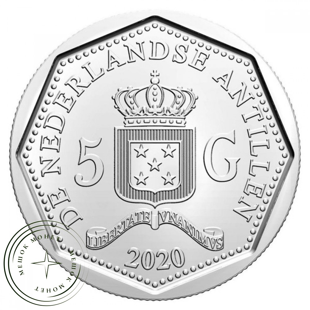 Реверс (правая монета): В центре расположен герб бывших Нидерландских Антильских островов, увенчанный короной. Вокруг надписи «DE NEDERLANDSE ANTILLEN», номинал «5 G» и девиз «LIBERTATE UNANIMUS» (Объединенные свободой).