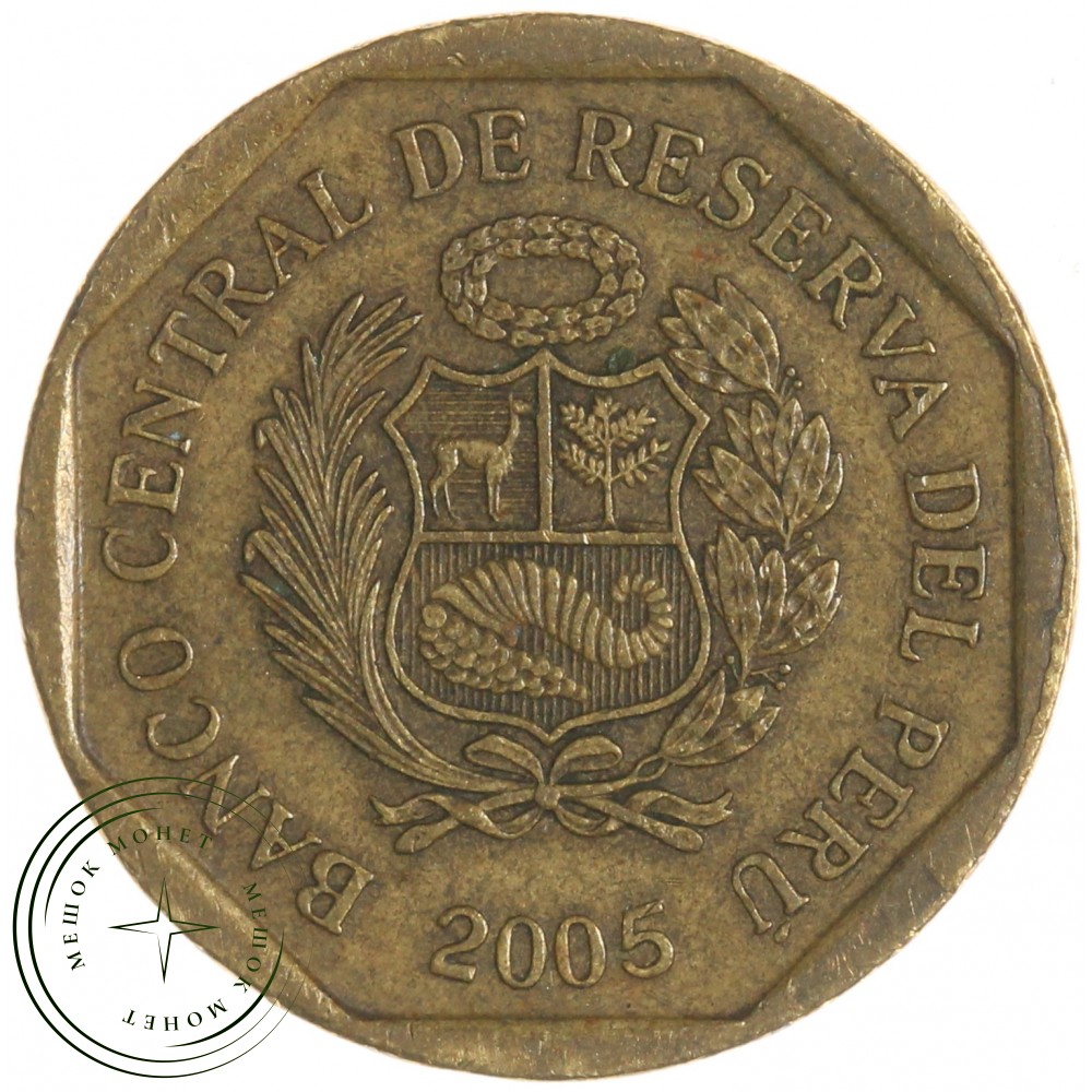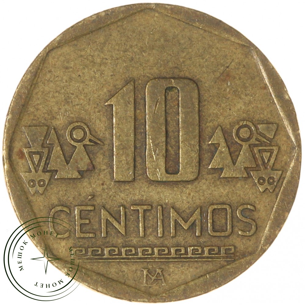 На аверсе монеты изображен национальный герб Перу: увенчанный лавровым венком щит, обрамленный двумя ветвями — пальмовой и лавровой. Щит разделен на три поля, в которых помещены изображения ламы, знаменитых своей ценной шерстью; хинного дерева, служащего сырьем для получения хинина; рога изобилия, наполненного золотыми самородками. Три эти фигуры символизируют фауну, флору и минеральные ресурсы Перу. На реверсе монеты изображена номинальная стоимость цифрами и прописью в две строки; под словом "сентим" нанесен по горизонтали геометрический орнамент, относящийся к культуре инков. По бокам цифры "10" расположены рисунки, представляющие стилизованные изображения птиц и растений.