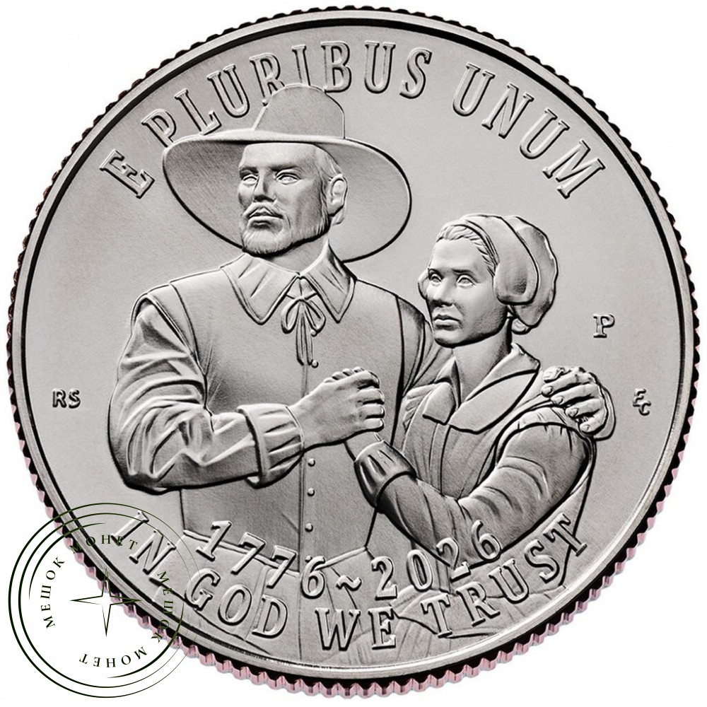 Аверс и реверс новой монеты США — квотера «Mayflower Compact» (Договор на борту «Мэйфлауэра») 2026 года выпуска. Эта монета является первой из пяти специальных четвертьдолларовых монет, выпущенных Монетным двором США в честь 250-летия (полуторавекового юбилея) основания страны (1776–2026).