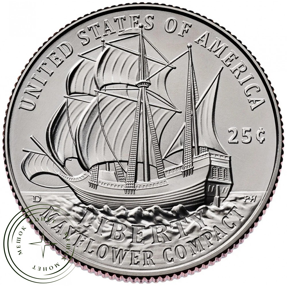 Реверс (обратная сторона): Изображен парусник «Мэйфлауэр» с полностью поднятыми парусами, плывущий на запад по неспокойному морю. Надписи включают «UNITED STATES OF AMERICA», «LIBERTY», «MAYFLOWER COMPACT» и «25¢».