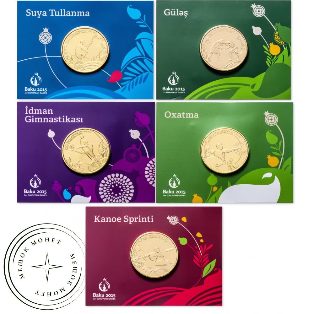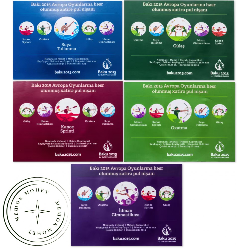 Набор из пяти медно-никелевых монет номиналом 1 манат, выпущенных в 2015 году в честь Первых Европейских игр в Баку.