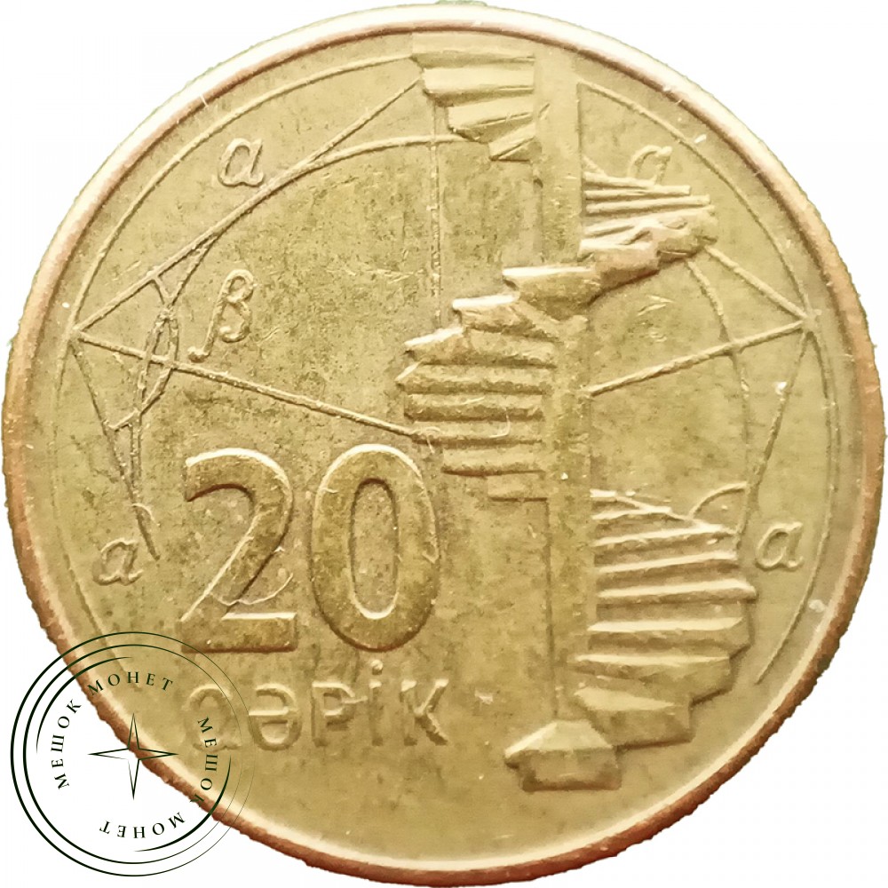 Аверс монеты представляет собой фрагмент изображения, на котором изображена винтовая лестница и геометрические формы. На обратной стороне монеты размещена карта Азербайджана.