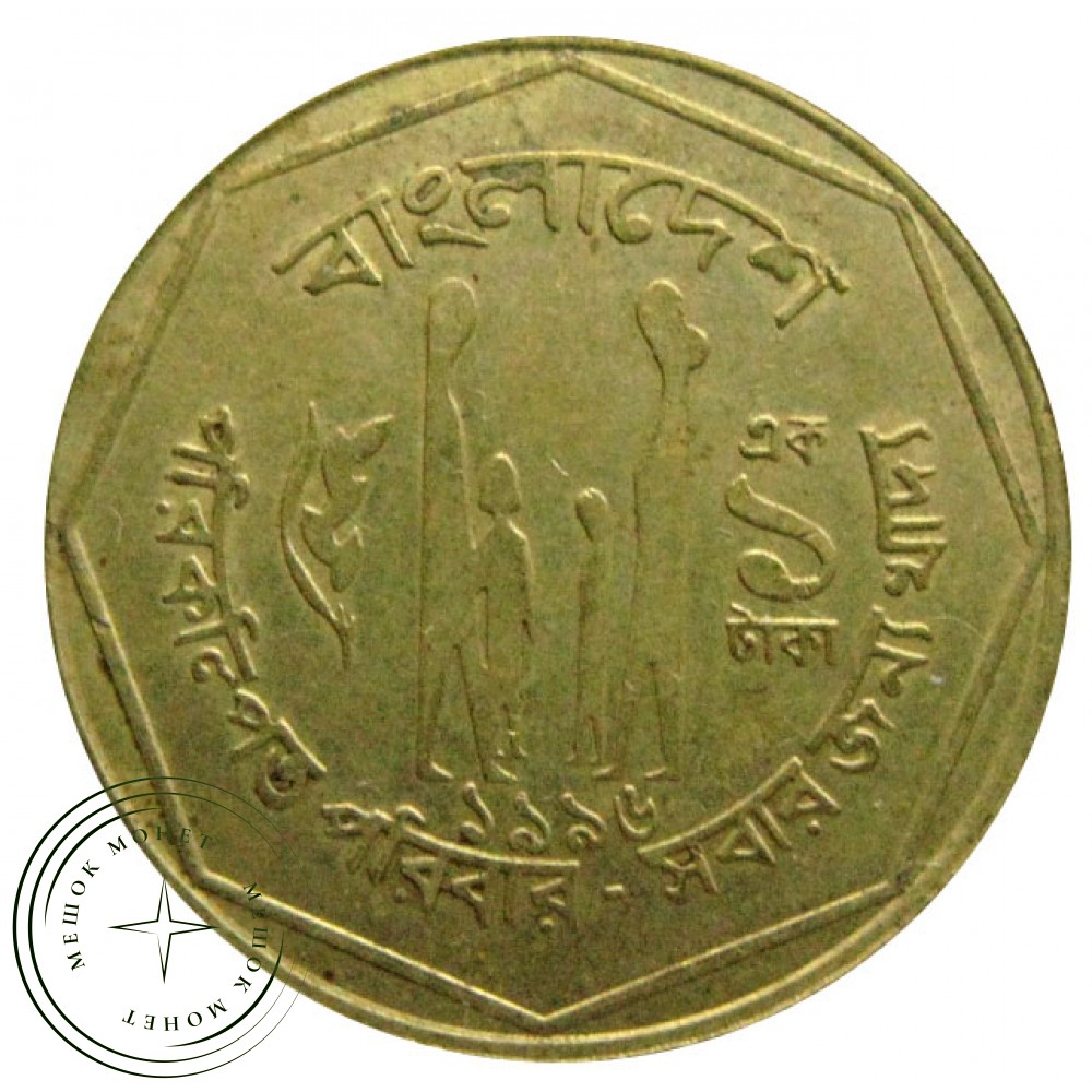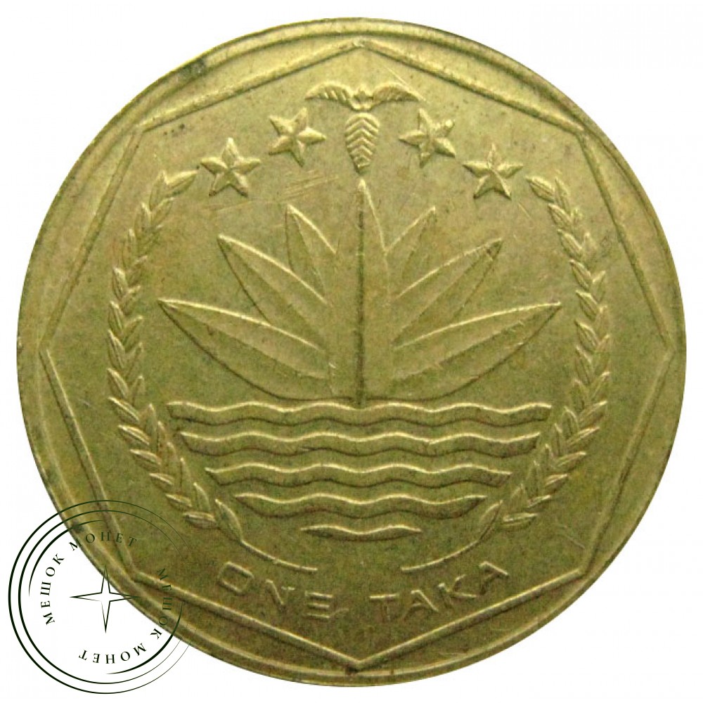 На аверсе изображён герб Бангладеш, принятый в 1971 г., вскоре после объявления независимости. Герб состоит из кувшинки, плавающей на поверхности водной глади, обозначенной пятью горизонтальными волнистыми линиями — символом многочисленных рек. С обеих сторон от цветка расположены колосья риса — сельскохозяйственной культуры, имеющей наибольшее значение для экономики страны и жизни ее населения. Вверху изображены три листа джута — один вертикальный и два горизонтальных. Бангладеш является крупнейшим мировым производителем текстильного волокна из этого растения. По сторонам выгравированы четыре пятиконечные звезды, символизирующие основополагающие принципы первой Конституции, принятой в 1972 г.: народность, гражданственность, социализм и демократия.