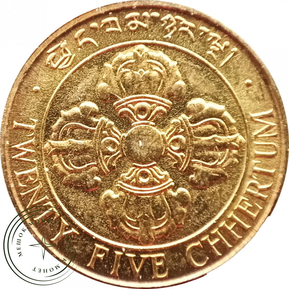 Монета номиналом 25 чертумов, выпущенная в 1979 году в Бутане. Диаметр составляет 22.00 мм, масса - 4.45 гр, толщина - 1.80 мм. Изготовлена из стали с покрытием из алюминиевой бронзы. Гурт рубчатый, тип монеты - регулярные. Krause: KM# 47a.