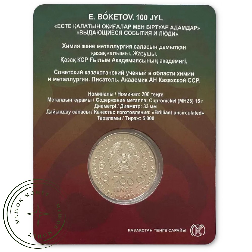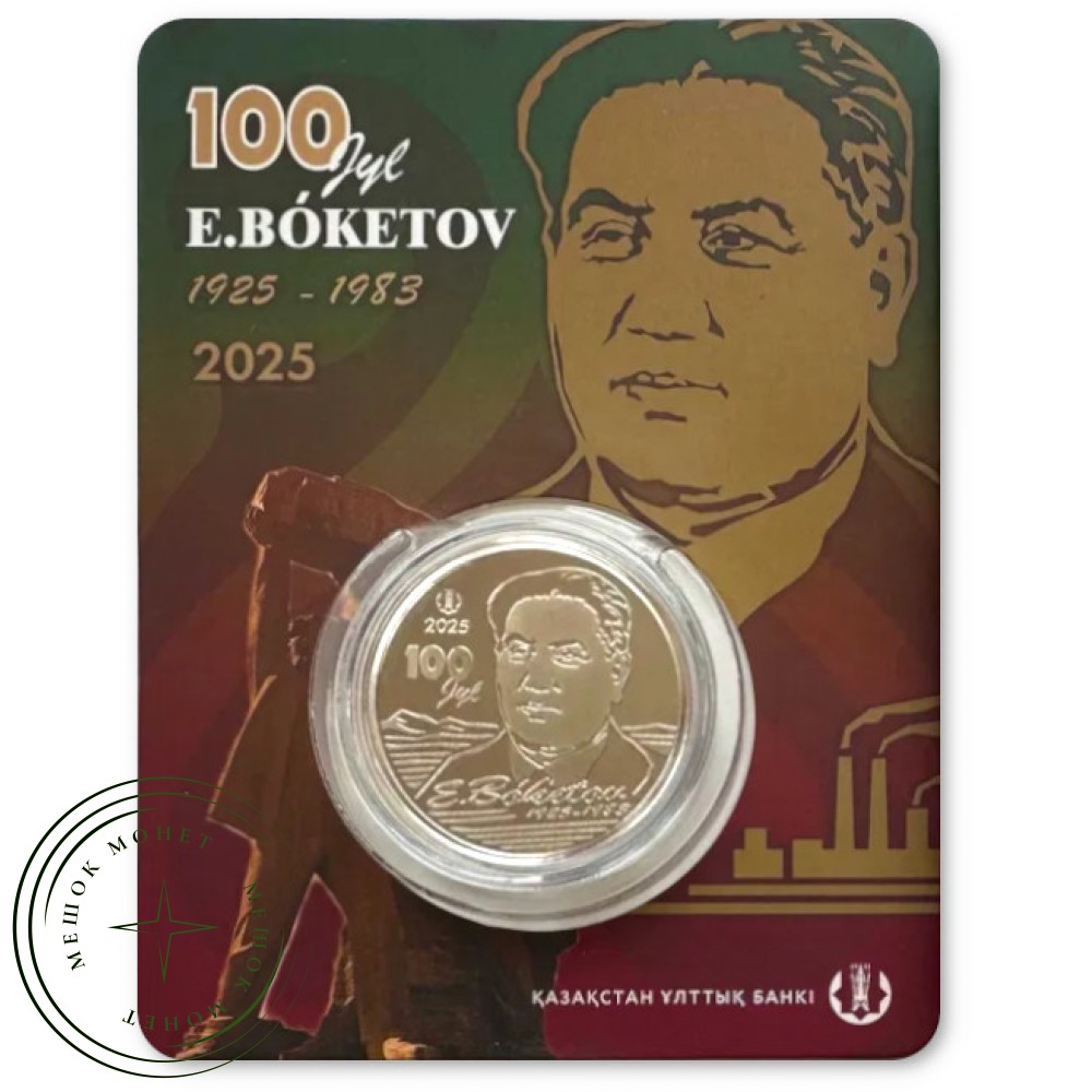Юбилейная монета Национального банка Казахстана, посвященная 100-летию со дня рождения Е. Бокетова, выдающегося казахского ученого и писателя.