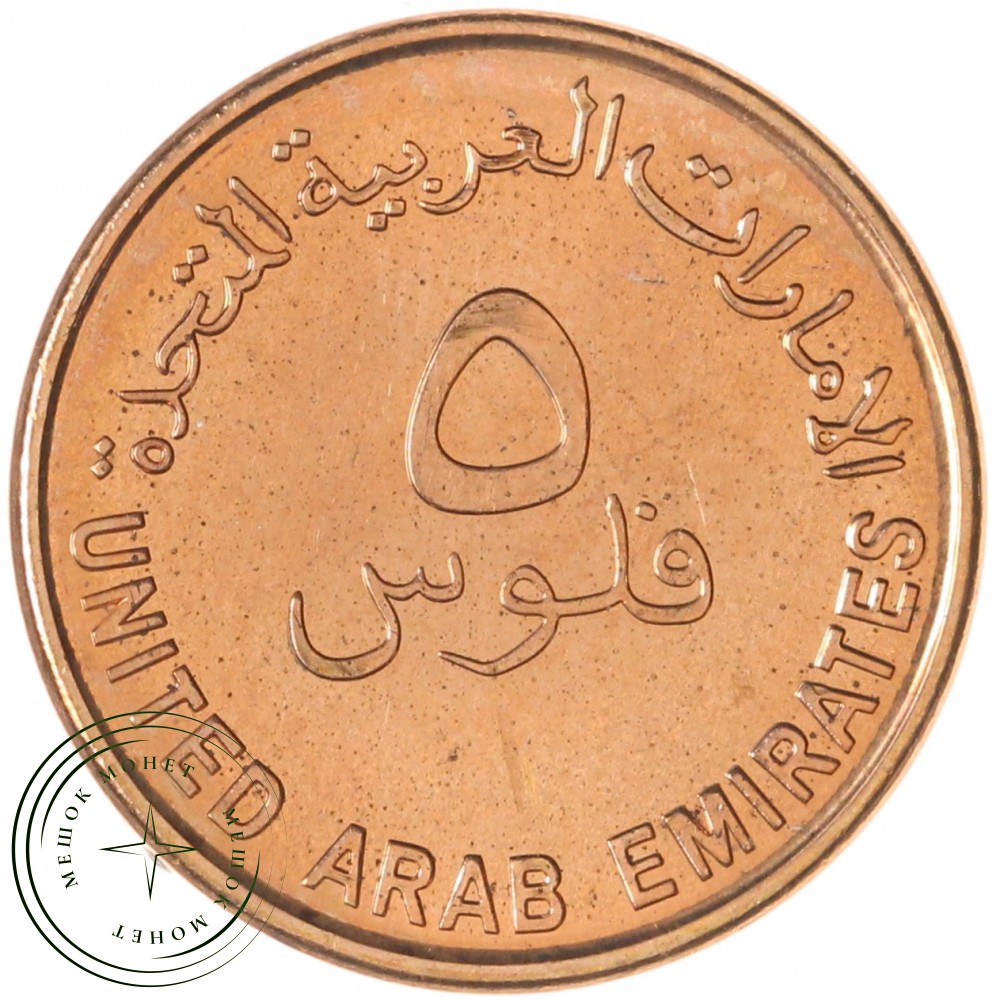 Монета ОАЭ 5 филсов 2014 года выпуска имеет диаметр 17 мм, массу 2.2 гр и толщину 1.5 мм. Она была отчеканена на монетном дворе Великобритании в Ллантризанте. Тираж монеты не указан. Монета выполнена из бронзы и имеет гладкий гурт. Форма монеты круглая, а отношение аверс/реверс - медальное (0°) ↑↑. Основными темами монеты является герб.