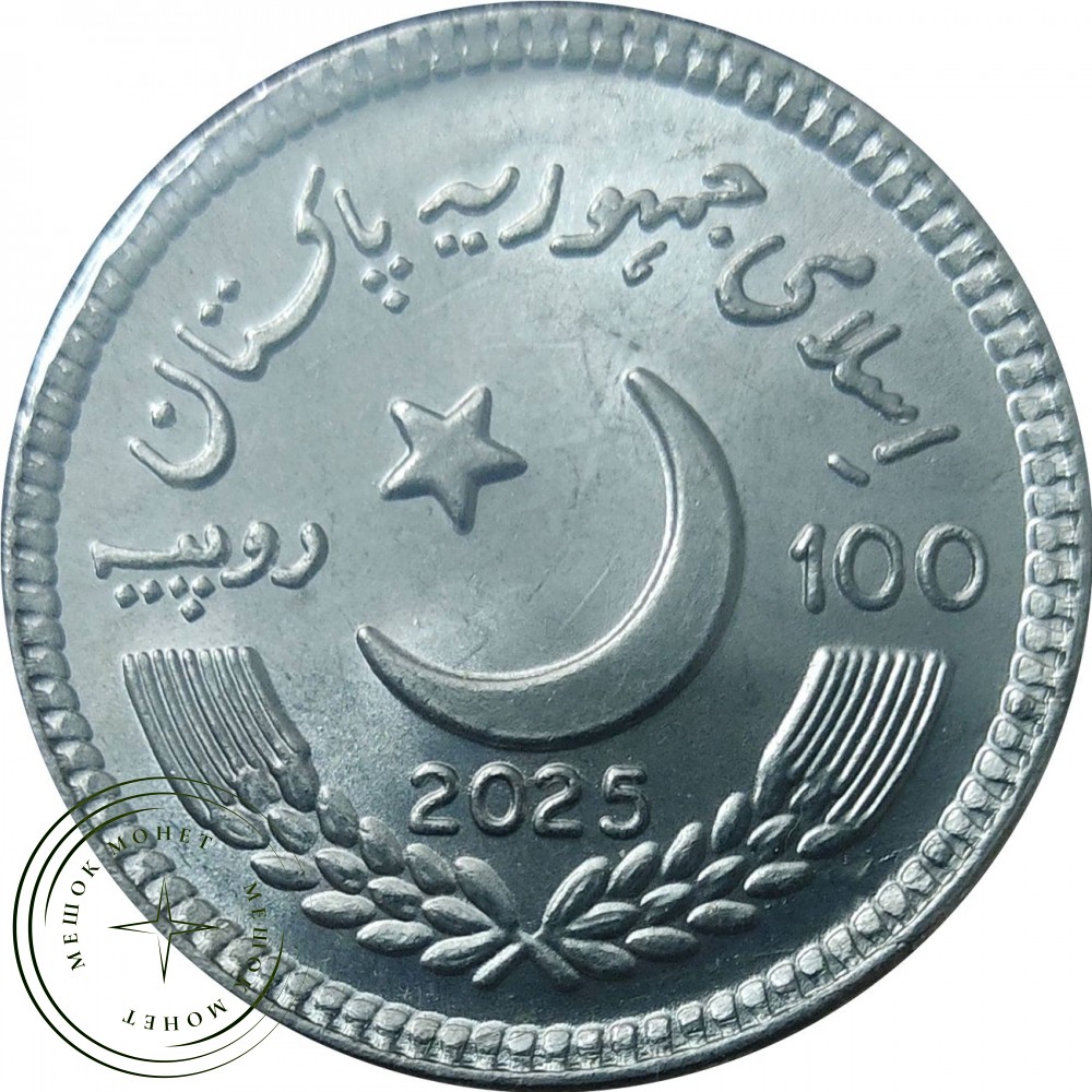 Дизайн аверса: В центре изображен полумесяц со звездой, надпись на урду «Исламская Республика Пакистан», год выпуска «2025» и номинал «100 рупий».