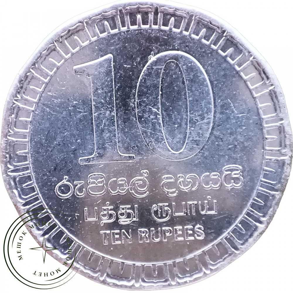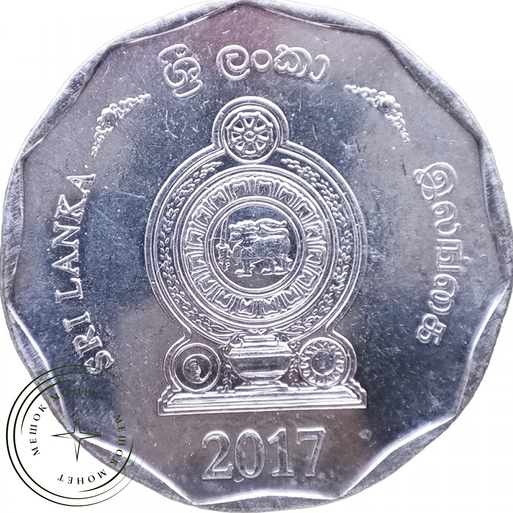 На реверсе монеты изображен национальный герб Шри-Ланки, утвержденный в 1972 г., когда страна обрела независимость. В центре окружности, образованный лепестками лотоса — символа Шри-Ланки, — изображен лев, держащий меч в передней правой лапе. Внизу на постаменте расположен сосуд традиционной формы с мягко ниспадающими из него рисовыми колосьями. Выше, по окружности — обрамляющие элементы композиции. К этим изображениям добавляются еще три: наверху — Колесо Дхармы, символ жизни в буддизме, внизу слева — луна, и внизу справа — солнце, традиционные сингальские символы.