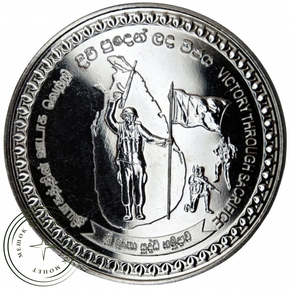 Описание: На реверсе монеты изображены солдаты и карта Шри-Ланки с надписями на сингальском, тамильском и английском языках, посвященными победе и жертвам.