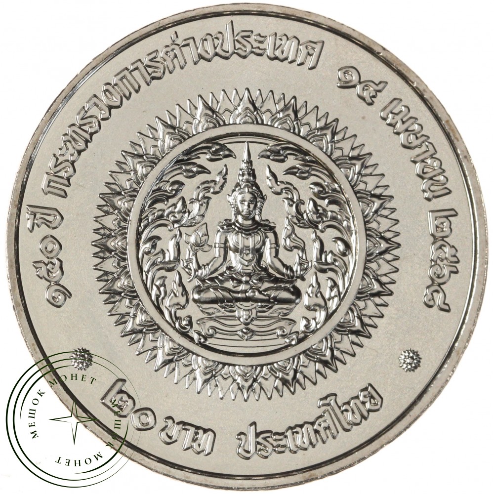 Памятная монета Таиланда номиналом 20 бат, выпущенная в 2025 году в честь 150-летия Министерства иностранных дел (МИД). Монета находится в защитной капсуле (UNC — "Uncirculated", то есть не обращавшаяся, с идеальным состоянием поверхности).