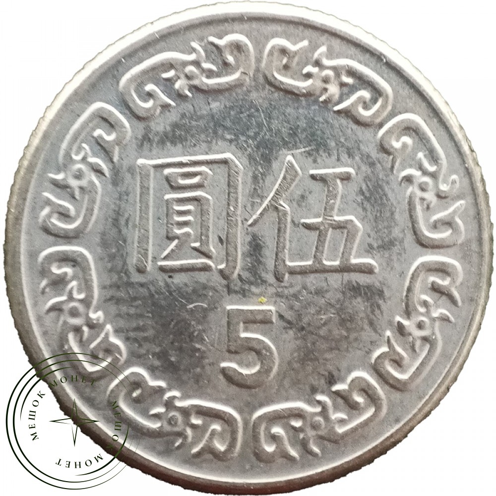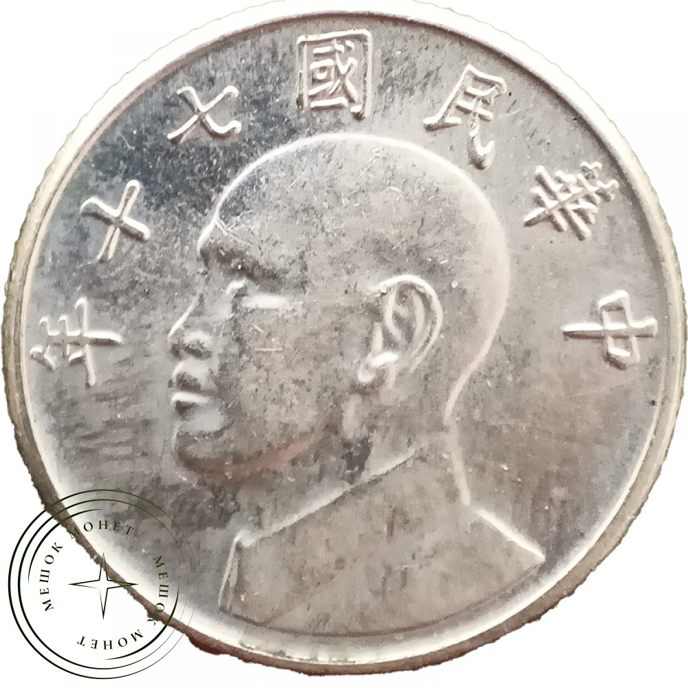 На аверсе монеты: вверху — год выпуска и название страны, в центре — профиль Чан Кайши (1887—1975). Это китайский военный и политический деятель (партия Гоминьдан), сменивший Сунь Ятсена. Воевал против японцев в 1930—1940-е гг., столкнулся с коммунистическими войсками Мао Цзэдуна в гражданской войне (1927—1950). Потерпел поражение (1949) и нашел убежище на острове, дав жизнь современному Тайваню. Во время Второй мировой войны входил в «большую четверку» вместе с Рузвельтом, Сталиным и Черчиллем.