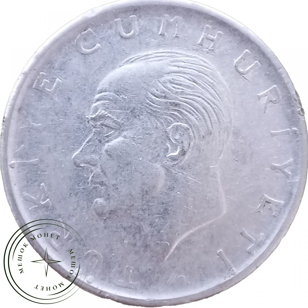 На аверсе монеты изображен Мустафа Кемаль Ататюрк (1881-1938), военный и политический деятель, основатель и президент республики с 1923 г. до его кончины в 1938 г. Ататюрк, лояльный и открытый по отношению к Западу, стал национальным героем Турции. На реверсе находятся колосья (слева) и оливковая ветвь (справа). Вверху изображены полумесяц и пятиконечная звезда: это исламские символы, представленные также на турецком флаге.