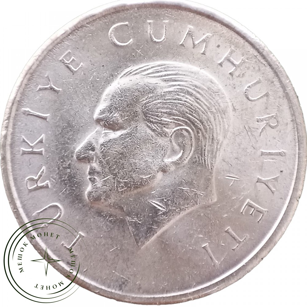 На аверсе монеты изображен Мустафа Кемаль Ататюрк (1881-1938), военный и политический деятель, основатель и президент республики с 1923 г. до его кончины в 1938 г. Ататюрк, лояльный и открытый по отношению к Западу, стал национальным героем Турции. На реверсе вверху изображены полумесяц и пятиконечная звезда: это исламские символы, представленные также на турецком флаге.