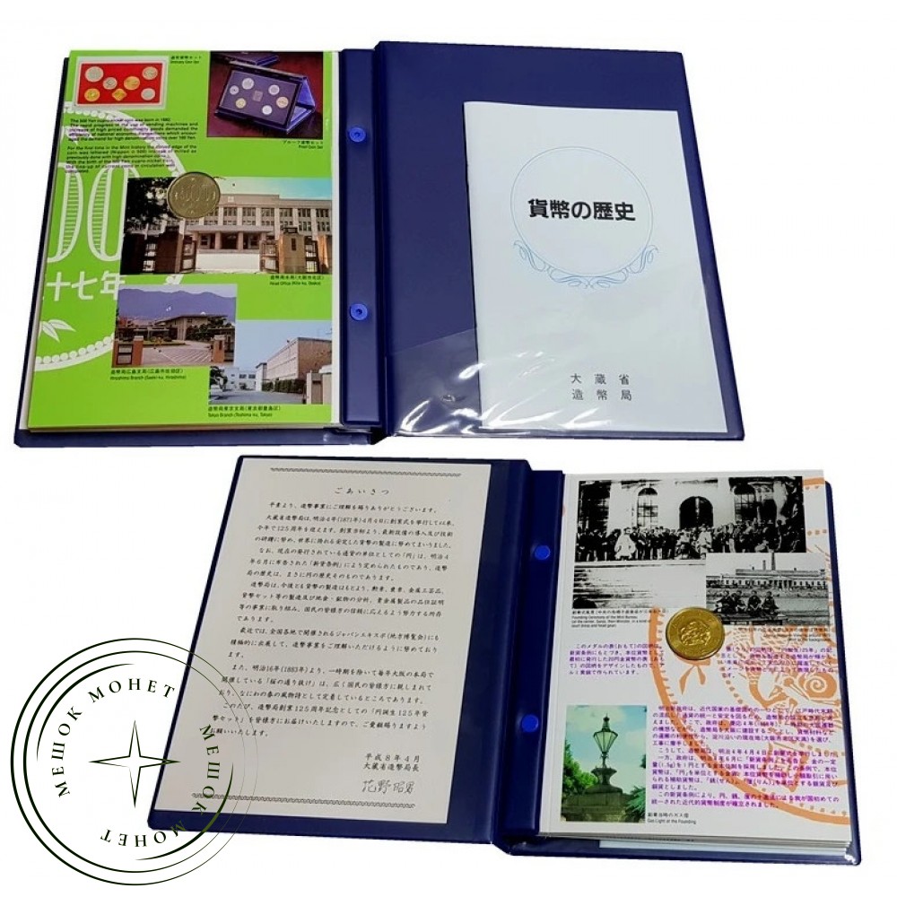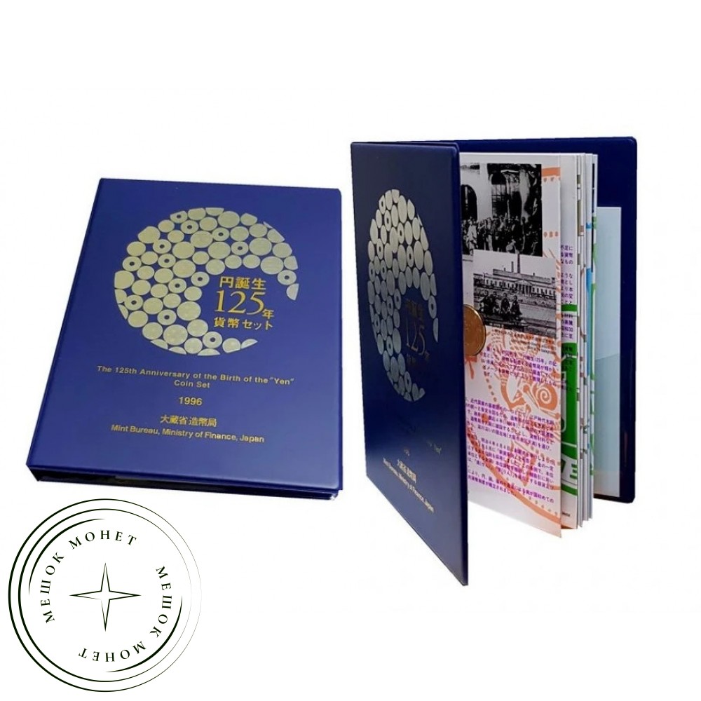 Официальный годовой набор монет Японии 1996 года (8-й год эпохи Хэйсэй), выпущенный Министерством финансов и Монетным двором Японии в честь 125-летия рождения иены.