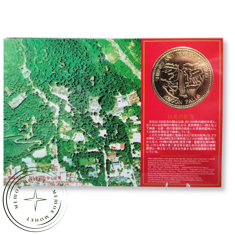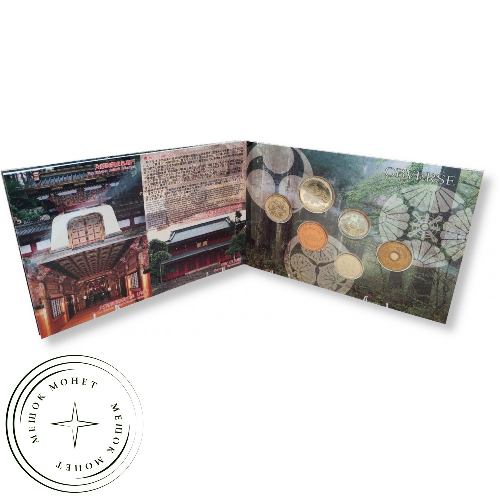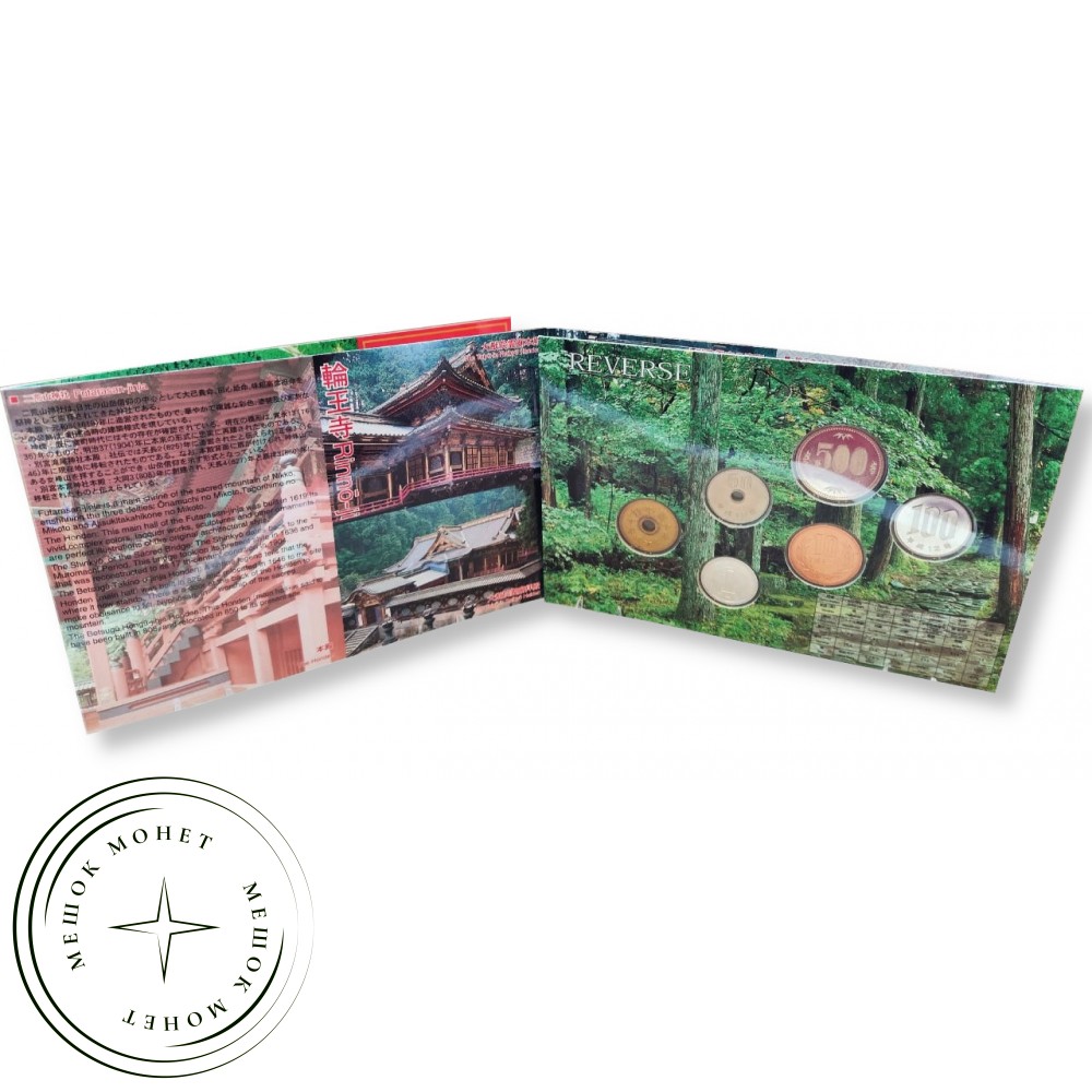 Коллекционный набор монет Японии 2000 года, посвященный объектам Всемирного наследия ЮНЕСКО - святилищам и храмам Никко (Nikko no Shaji). Храм Футарасан, изображенный на наборе, был построен в 1619 году и посвящен трем божествам горы.