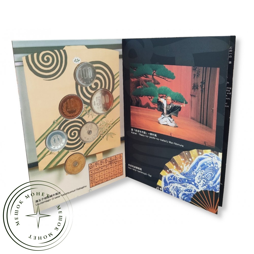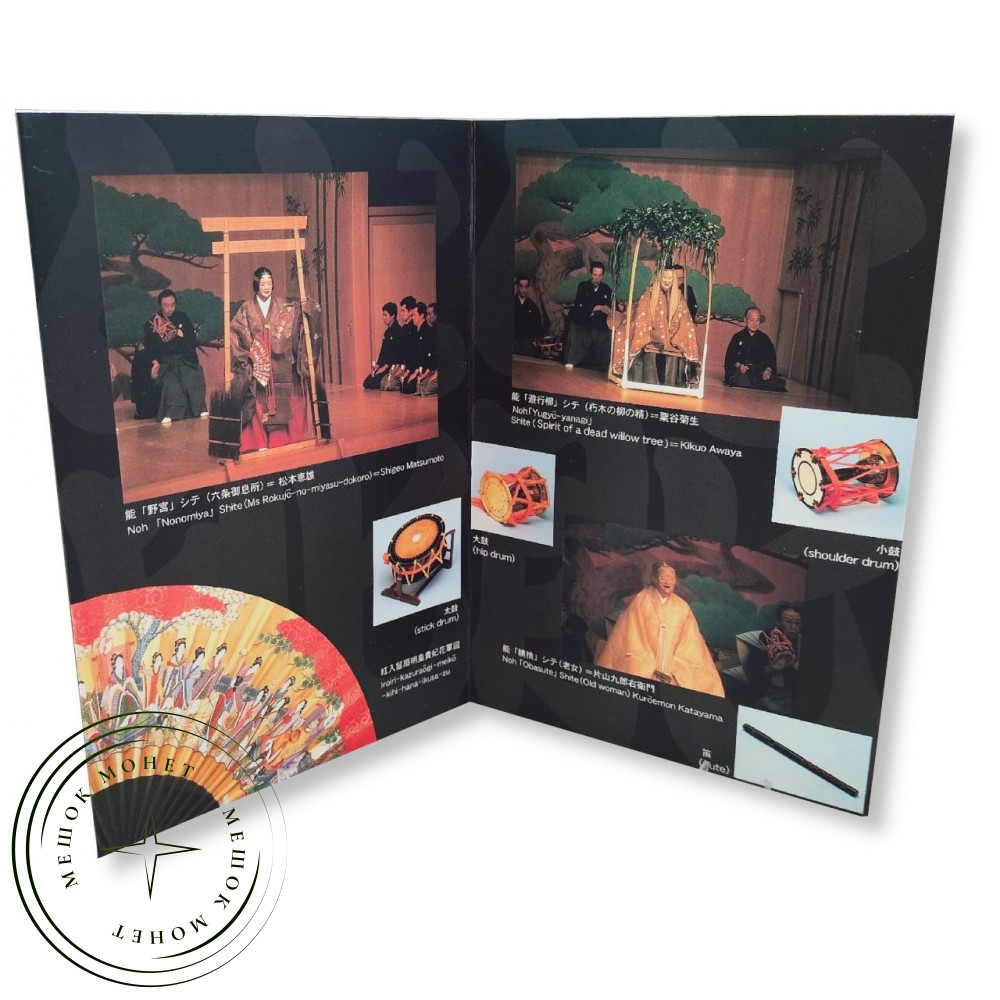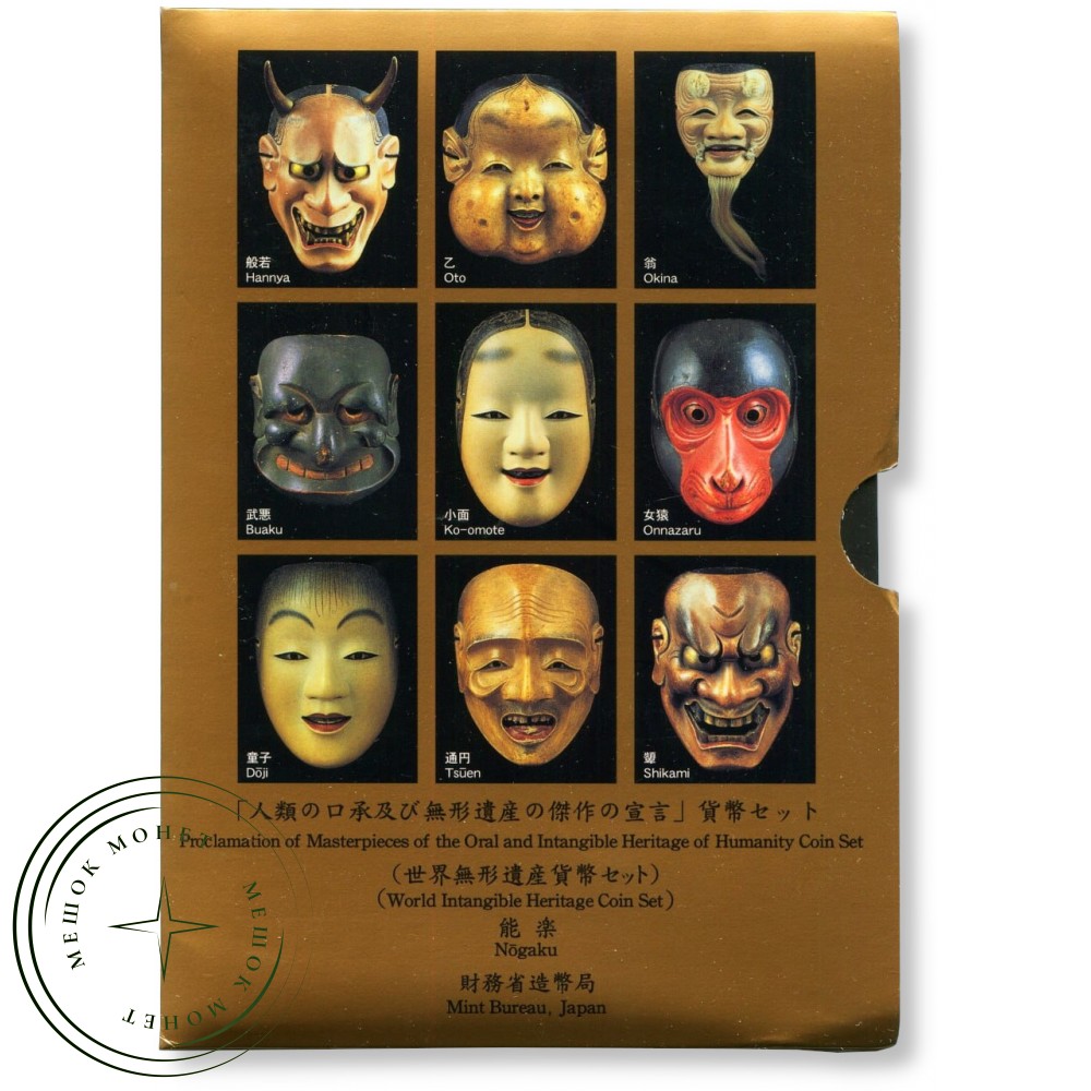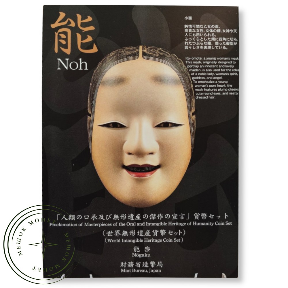 Коллекционный набор монет Японии 2001 года, посвященный театру Но (Nōgaku). Этот выпуск является частью серии, отмечающей шедевры устного и нематериального культурного наследия человечества.